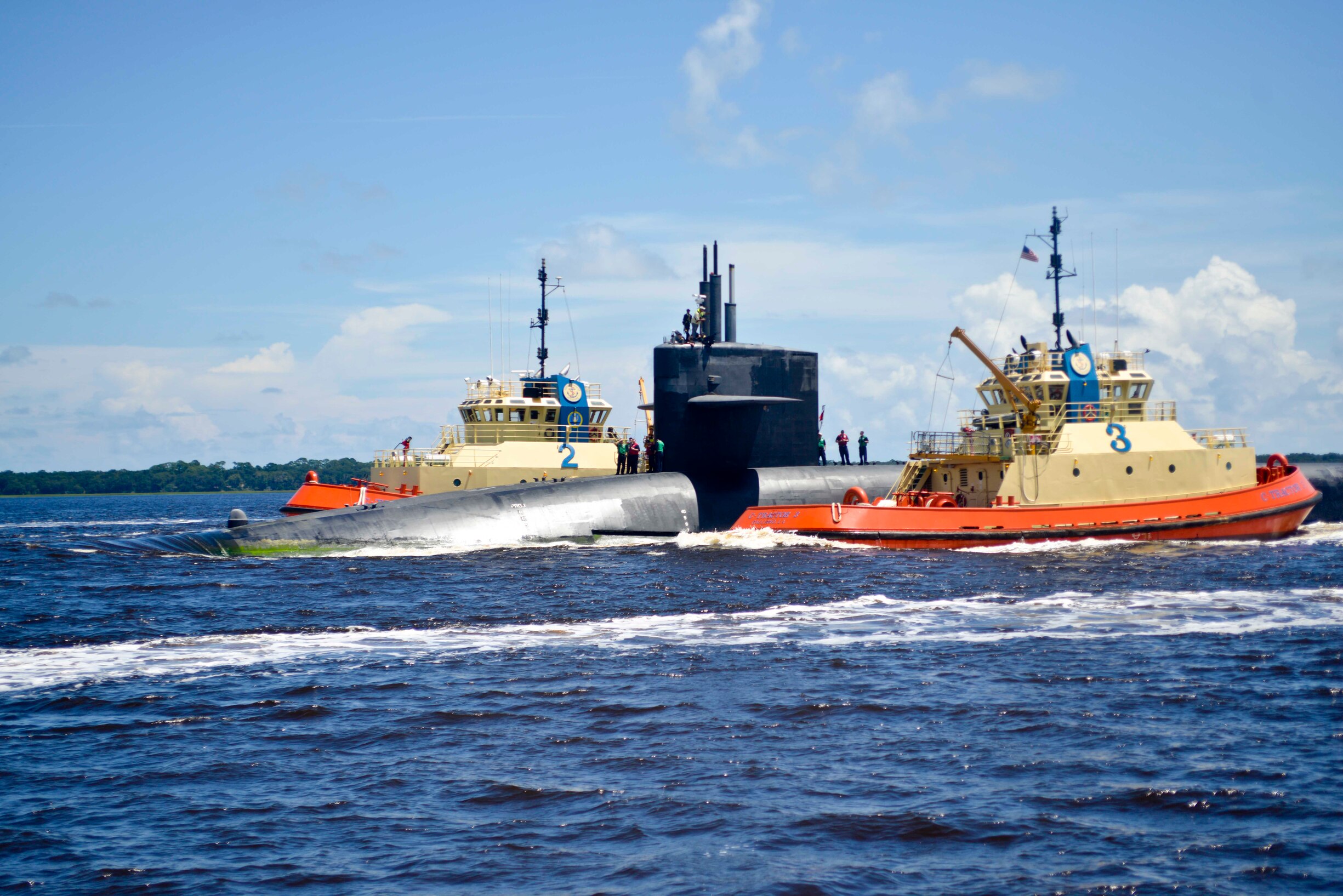 170825-N-IC565-023 KINGS BAY, Ga. (Aug 25, 2017) The Ohio-class ballistic-missile submarine USS Maryland (SSBN 738) returns to its homeport at Naval Submarine Base Kings Bay, Ga., following a strategic deterrent patrol. Maryland is the fourth U.S. Navy boat named in honor of the state. The boat is one of five ballistic-missile submarines stationed at the base and is capable of carrying up to 20 submarine-launched ballistic missiles with multiple, indeendently-target warheads. (U.S. Navy photo by Mass Communication Specialist 2nd Class Bradley J. Gee/Released)