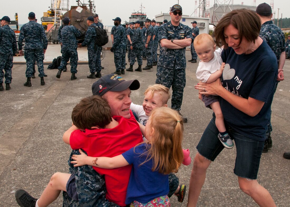 170905-N-UD469-166 BANGOR, Wash. (Sept. 5, 2017) Chief Electronics Technician Matthew Goodwin, assigned to the Ohio-class ballistic-missile submarine USS Alabama (SSBN 731), is welcomed home to Naval Base Kitsap-Bangor by his family following the boat's routine strategic deterrent patrol. Alabama is one of eight ballistic-missile submarines stationed at the base providing the most survivable leg of the strategic deterrence triad for the United States. (U.S. Navy photo by Mass Communication Specialist 1st Class Amanda R. Gray/Released)