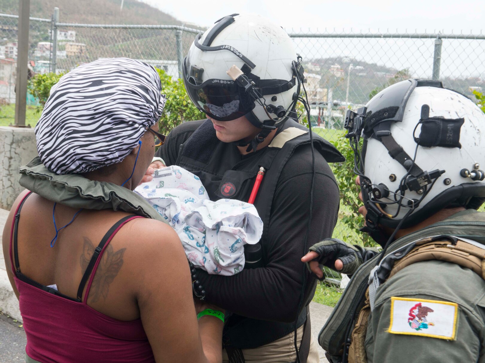 170907-N-TO519-162 CARIBBEAN SEA (Sept. 7, 2017) Naval Aircrewman (Helicopter) 2nd Class John Malico and Aircrewman (Rescue Swimmer) 1st Class Erick Sotelo, both assigned to Helicopter Sea Combat Squadron (HSC) 22, help a mother and child during the U.S. Navy relief efforts in the U.S. Virgin Islands following Hurricane Irma. The DoD is supporting FEMA, the lead federal agency, in helping those affected by Hurricane Irma to minimize suffering and is one component of the overall whole-of-government response effort. (U.S. Navy photo by Mass Communication Specialist 2nd Class Nathan Wilkes/Released)