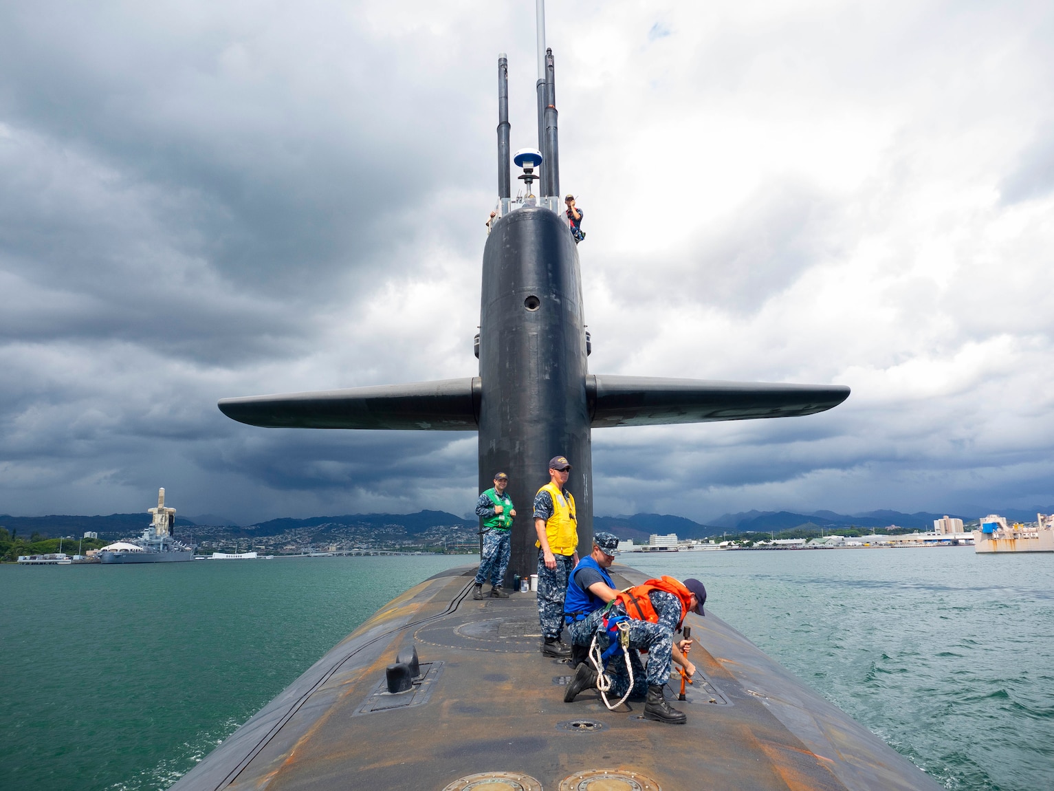 170911-N-TA321-026 PEARL HARBOR (Sept. 11, 2017) The Ohio-class ballistic missile submarine USS Nebraska (SSBN 739) passes by the USS Arizona and USS Missouri Memorials as it departs Pearl Harbor for a training and proficiency underway. Nebraska is one of eight ballistic missile submarines stationed at Naval Base Kitsap-Bangor and recently completed an extended major maintenance period, including an engineered refueling overhaul, at Puget Sound Naval Shipyard and Intermediate Maintenance Facility. (U.S. Navy photo by Culinary Specialist Seaman Joseph W. Weiser/Released)