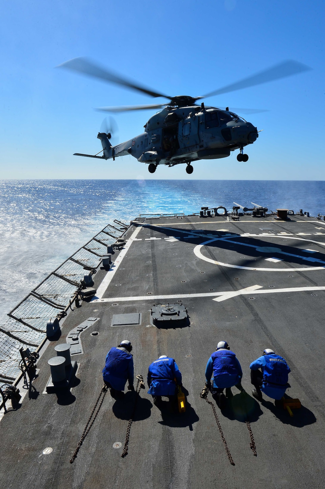 171004-N-QR145-068 MEDITERRANEAN SEA (Oct. 4, 2017) A helicopter assigned to the French navy frigate FS Languedoc (D 653) lands on the flight deck of the Arleigh Burke-class guided-missile destroyer USS Porter (DDG 78) in the Mediterranean Sea. Porter is forward-deployed to Rota, Spain, on its fourth patrol in the U.S. 6th Fleet area of operations in support of regional allies and partners, and U.S. national security interests in Europe. (U.S. Navy photo by Mass Communication Specialist 3rd Class Krystina Coffey/Released)