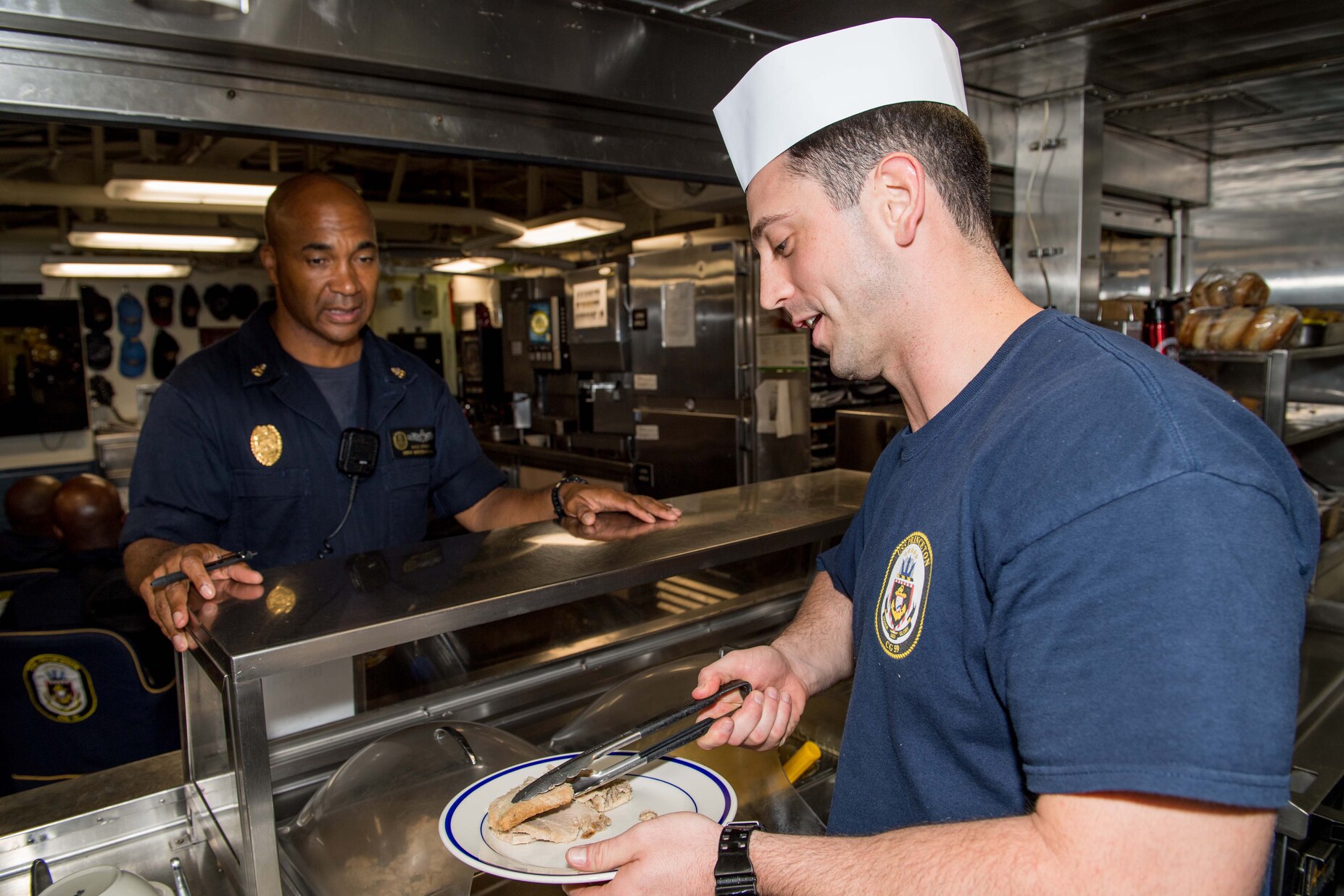 171004-N-VR594-0031 ARABIAN GULF (Oct. 4, 2017) Operations Specialist 3rd Class Benjamin Rodriguez serves dinner to Senior Chief Master-at-Arms Maurice Stigger in the Chief's Mess aboard the Ticonderoga-class guided-missile cruiser USS Princeton (CG 59). Princeton is deployed in the U.S. 5th Fleet area of operations in support of maritime security operations designed to reassure allies and partners, and preserve the freedom of navigation and the free flow of commerce in the region. (U.S. Navy photo by Mass Communication Specialist 3rd Class Kelsey J. Hockenberger/Released)