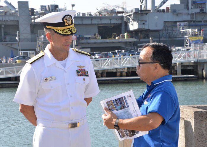 171012-N-UN340-001 SAN DIEGO (Oct. 12, 2017) Rear Adm. Carl Chebi, program executive officer for Command, Control, Communications, Computers and Intelligence, discusses science, technology, engineering and mathematics (STEM) initiatives with Space and Naval Warfare Systems Command STEM Federal Action Ahn Nuzen at San Diego’s Broadway Pier. The two were on hand representing the Navy for DoD’s $8M donation to the Sweetwater Union School District’s STEM program, which supports a large number of school children of active duty military members. (U.S. Navy photo by Rick Naystatt/Released)