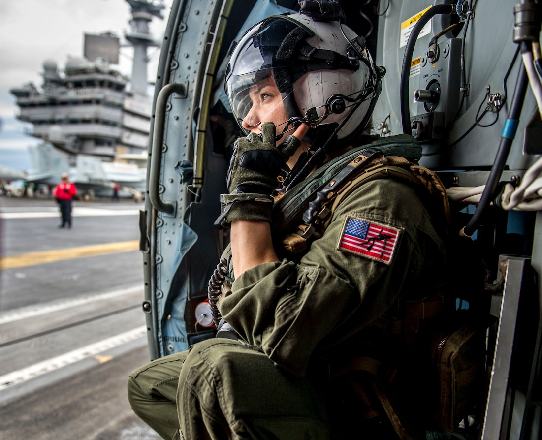 171025-N-NG136-018 ATLANTIC OCEAN (Oct. 25, 2017) Naval Aircrewman (Helicopter) 3rd Class Samantha Jelonnek prepares to take off in an MH-60R Sea Hawk attached to Helicopter Maritime Strike Squadron (HSM) 70 embarked aboard the aircraft carrier USS George H.W. Bush (CVN 77) during exercise Bold Alligator 2017 (BA17). Improving Navy-Marine Corps amphibious core competencies along with coalition, North Atlantic Treaty Organization (NATO), Allied and partner nations is a necessary investment in the current and future readiness of our forces. BA17 takes place Oct. 18 - 30, 2017, ashore along the eastern seaboard. (U.S. Navy photo by Mass Communication Specialist Seaman Zachary P. Wickline/Released)