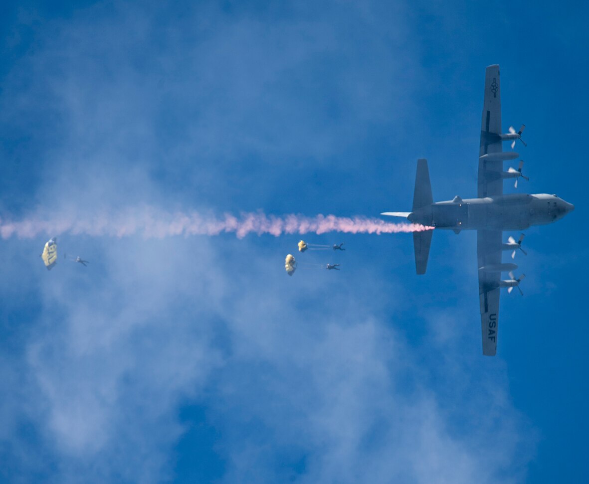 171104-N-RM689-034 FORT PIERCE, Fla. (Nov. 4, 2017) Members of the U.S. Navy parachute team, the Leap Frogs, deploy their parachutes after exiting an C-130 Hercules cargo plane assigned to the 139th Air Lift Wing from Missouri as part of a parachute demonstration during the 32nd annual Navy SEAL Muster and Music Festival hosted by the National Navy UDT-SEAL Museum. The Leap Frogs are based out of San Diego and perform aerial parachute demonstrations around the nation in support of Naval Special Warfare and Navy recruiting. (U.S. Navy photo by Mass Communication Specialist 3rd Class Kelsey L. Adams/Released)