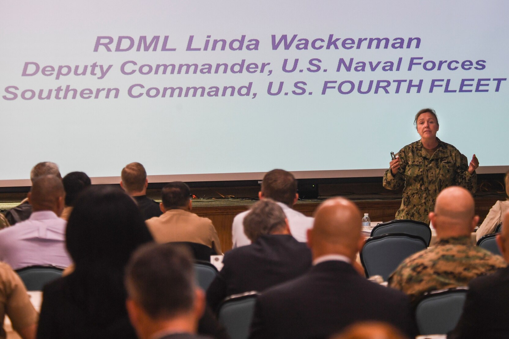 171128-N-TP832-007 MAYPORT, Fla. (Nov. 28, 2017) Rear Adm. Linda Wackerman, deputy commander, U.S. Naval Forces Southern Command/U.S. 4th Fleet, gives opening remarks during the annual Maritime Synchronization Conference aboard Naval Station Mayport. The conference brings together U.S. Navy attachés and section chiefs from the U.S. Southern Command area of responsibility, which encompasses the Caribbean and Central and South America, while it also includes other service surrogates and stakeholders from component, service, theater and national agencies to discuss common naval issues and concerns to develop innovative solutions for current and future operations. (U.S. Navy photo by Mass Communication Specialist 3rd Class Michael Lopez/Released)