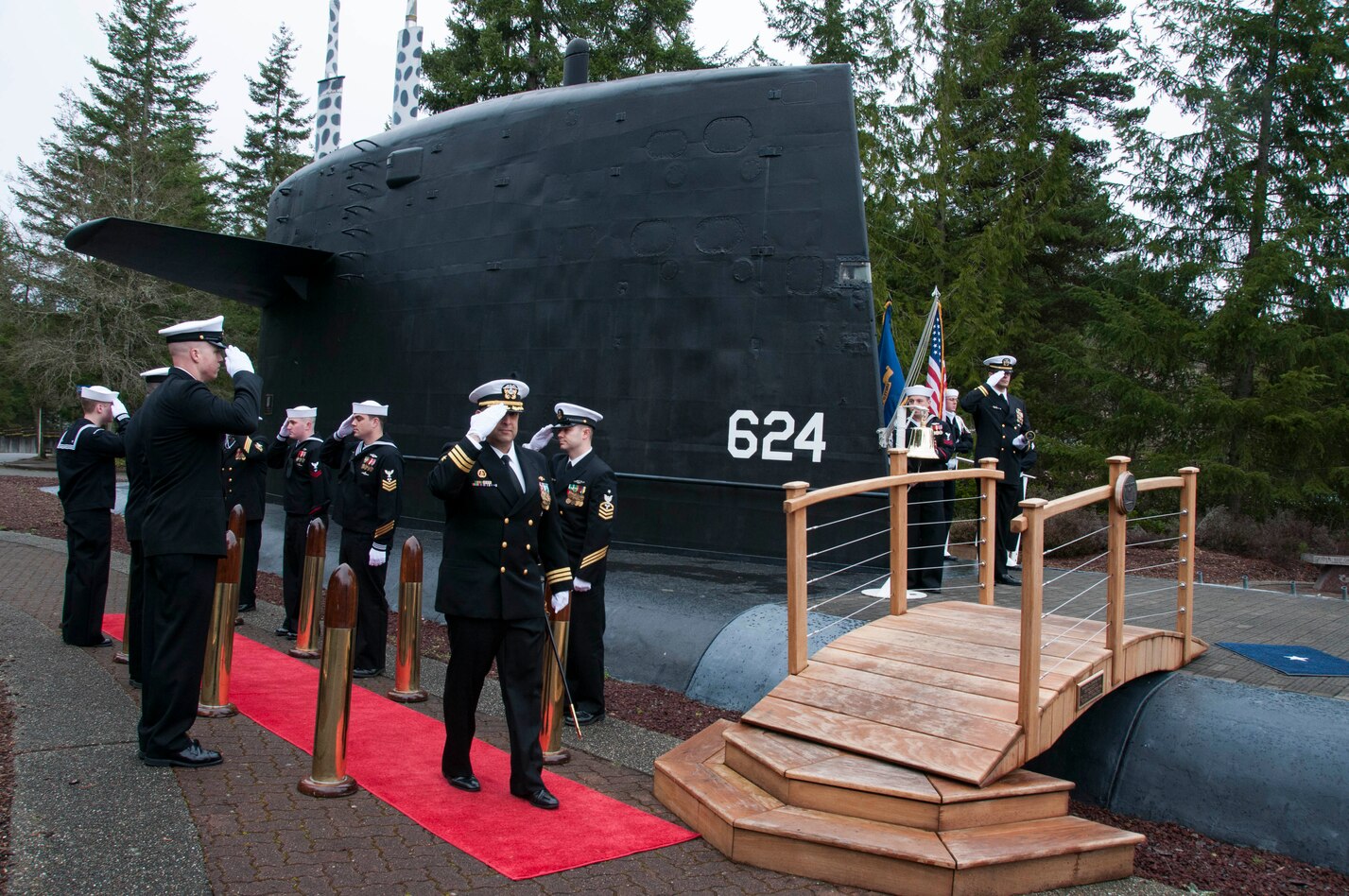 BANGOR, Wash. (March 4, 2016) - Cmdr. Edward Robledo, from El Paso, Texas, receives honors from the sideboys as the official party arrives during a change of command ceremony for the Gold crew of the Ohio-class ballistic-missile submarine USS Henry M. Jackson (SSBN 730). During the ceremony, held at Deterrent Park, Cmdr. Kevin Macy, from El Dorado, Calif., relieved Robledo as commanding officer. (U.S. Navy photo by Mass Communication Specialist 2nd Class Amanda R. Gray/Released)