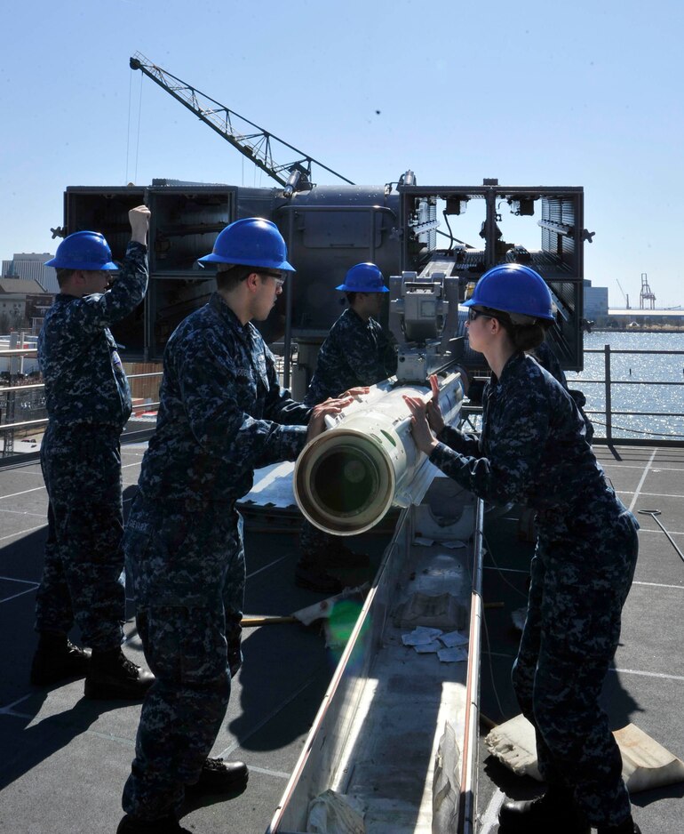 NEWPORT NEWS, Va. (Mar 09, 2016) -- Pre-Commissioning Unit Gerald R. Ford (CVN 78) Sailors from Combat Systems department practice loading an inert-dummy RIM-162 Evolved SeaSparrow Missile into the NATO Sea Sparrow Missile System launcher. Training with inactive and dummy rounds helps prepare these Sailors for later evolutions involving the loading of live ordnance. Ford is scheduled for commissioning in 2016. (U.S. Navy photo by Mass Communication Specialist 1st Class Patrick Grieco/Released)