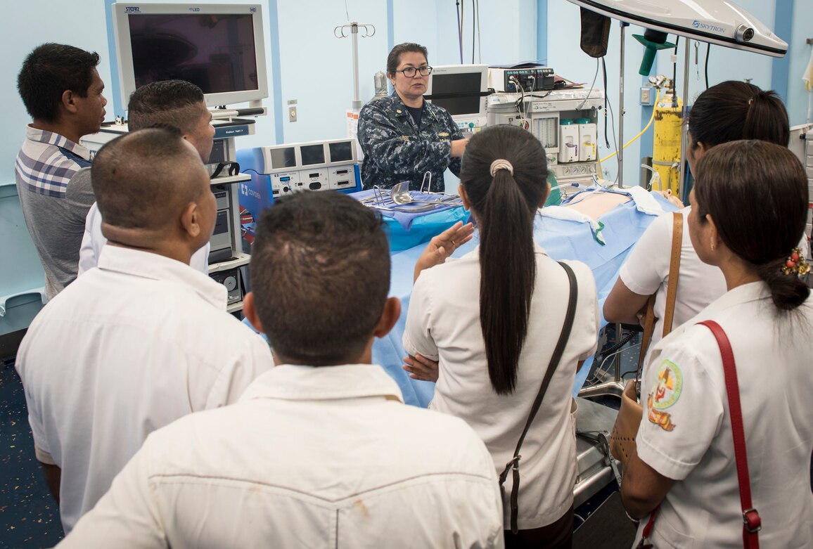 160609-N-SX983-044 DILI, Timor Leste (June 9, 2016) Lt. Cmdr. Reynalda McBee, a surgical nurse assigned to USNS Mercy (T-AH 19), explains shipboard operation procedures to Timorese nurses during a tour of the ship. Pacific Partnership 2016 marks the sixth time the mission has visited Timor Leste since its first visit in 2006. Medical, engineering and various other personnel embarked aboard Mercy will work side-by-side with partner nation counterparts, exchanging ideas, building best practices and relationships to ensure preparedness should disaster strike. (U.S. Navy photo by Mass Communication Specialist 2nd Class Lindsey E. Skelton/Release)