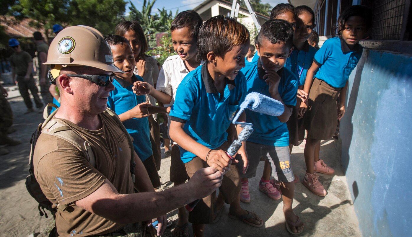 160610-M-TM809-635 DILI, Timor Leste (June 10, 2016) Constructionman 2nd Class Falcon Allaire, a native of Las Cruces, New Mexico, lets a Timorese boy help him paint Aimutin School during Pacific Partnership 2016. U.S. Navy Seabees and U.S. Marines are working alongside Timorese and Australian engineers on various construction projects at Aimutin and Maneluana School. This year marks the sixth time the mission visited Timor Leste since it’s first visit in 2006. Medical, engineering and various other personnel embarked aboard hospital ship USNS Mercy (T-AH 19) are working side-by-side with partner nation counterparts, exchanging ideas, building best practices and relationships to ensure preparedness should disaster strike. (U.S. Marine Corps photo by Cpl. Brittney Vella/Released)