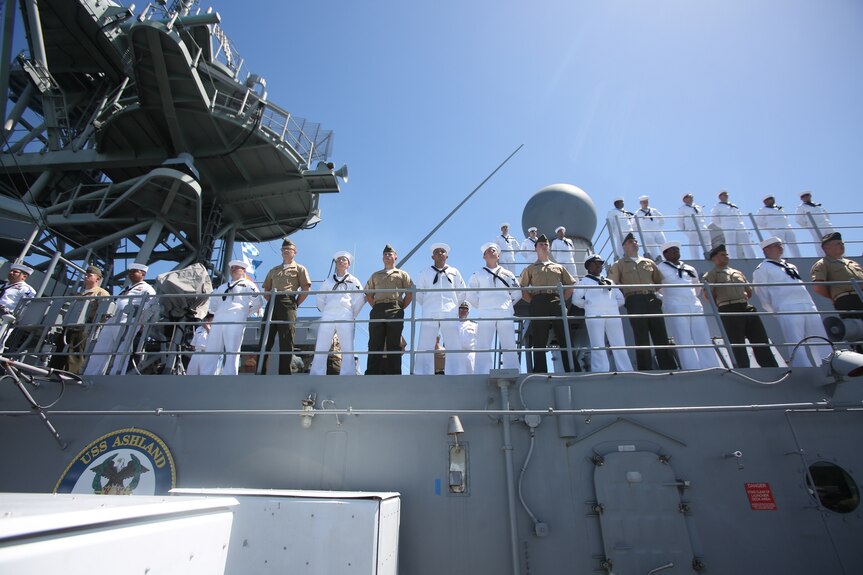 SATTAHIP, THAILAND (June 15, 2016) - U.S. Sailors and Marines onboard USS Ashland (LSD 48) man the rails of the ship as they come into port to participate in exercise Cooperation Afloat Readiness and Training (CARAT) in Sattahip, Thailand, June 15.CARAT is a series of annual, bilateral maritime exercises between the U.S. Navy, U.S. Marine Corps and the armed forces of nine partner nations to include Bangladesh, Brunei, Cambodia, Indonesia, Malaysia, Singapore, the Philippines, Thailand and Timor-Leste.The Ashland is assigned to U.S. 7th Fleet. (U.S. Navy photo by Lance Cpl. Carl King Jr/. Released)