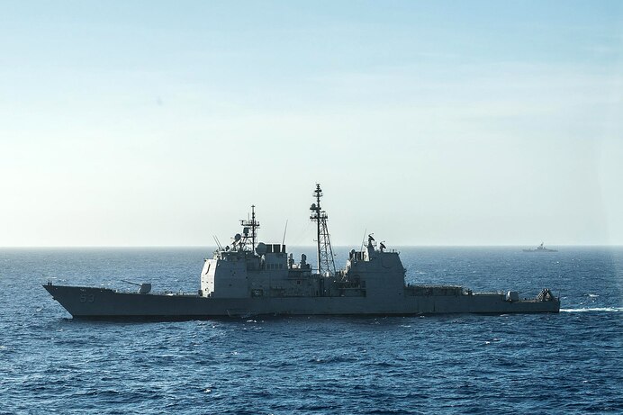 160616-N-EH218-614: PHILIPPINE SEA (June 16, 2016) The guided-missile cruiser USS Mobile Bay (CG 53) transits the Philippine Sea during Malabar 2016. A trilateral maritime exercise, Malabar is designed to enhance dynamic cooperation between the Indian Navy, JMSDF and U.S. Navy forces in the Indo-Asia-Pacific. (U.S. Navy photo by Mass Communication Specialist 2nd Class Ryan J. Batchelder/Released)