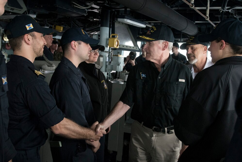 160616-N-LV331-001 MEDITERRANEAN SEA (June 16, 2016) Secretary of the Navy (SECNAV) Ray Mabus greets Italian navy and U.S. Navy Sailors aboard the guided-missile destroyer USS Mason (DDG 87) during the U.S. Navy�s first underway replenishment where the fuel was made from alternative sources and transferred from a partner nation�s ship. The Italian navy auxiliary ship ITS Etna (A5326) provided Mason with biofuel, made from waste fat beef and inedible vegetable oil, as part of the Great Green Fleet initiative. (U.S. Navy photo by Mass Communication Specialist 2nd Class Armando Gonzales/Released)