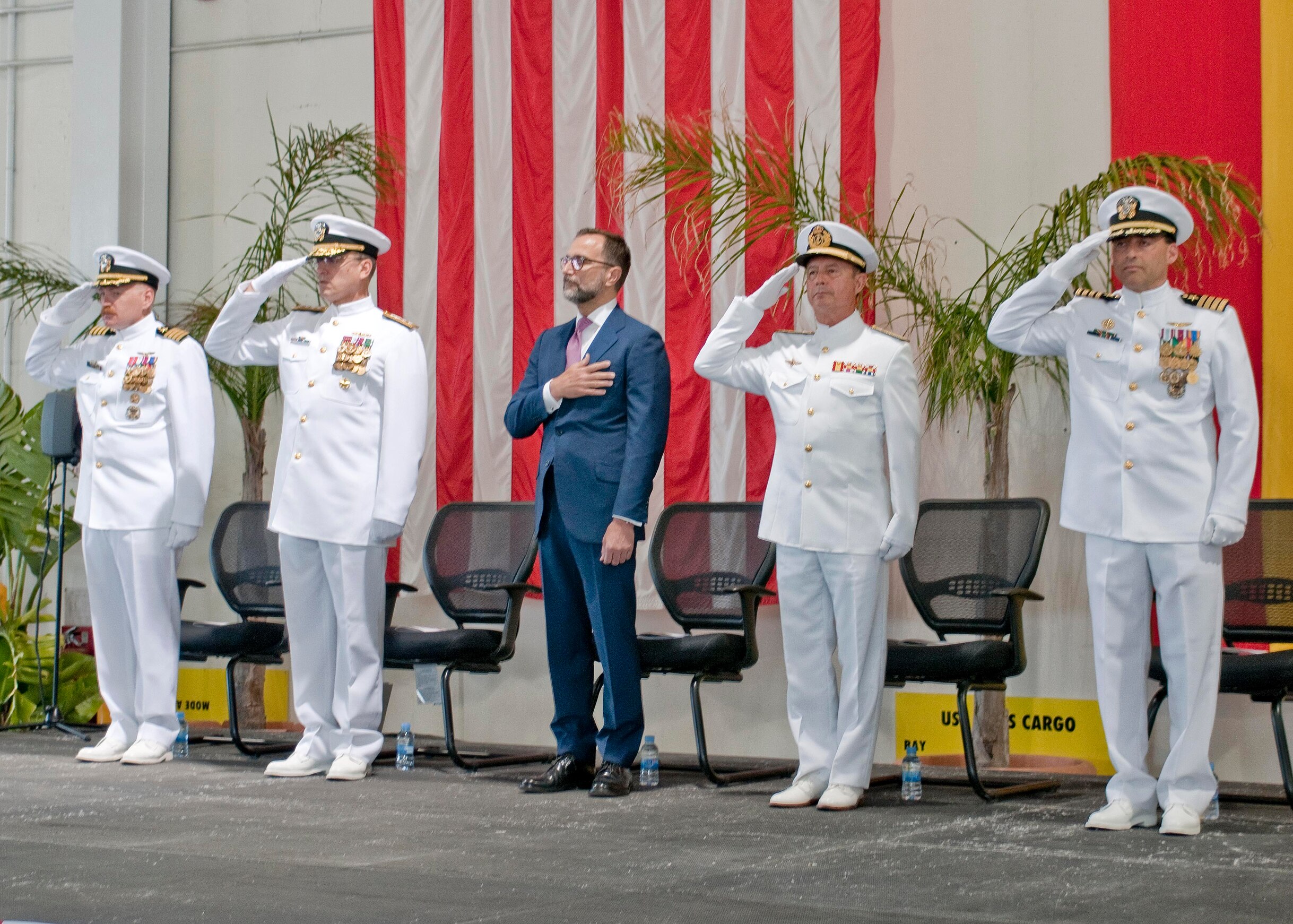 160623-N-RD157-042 NAVAL STATION ROTA, Spain (June 23, 2016) The official party renders honors during the U.S. national anthem at a change of command ceremony June 23, 2013. During the ceremony, Capt. Greg Pekari relinquished command to Capt. Michael MacNicholl. Naval Station Rota enables and supports operations of U.S. and allied forces and provides quality services in support of the fleet, fighter, and family for Commander, Navy Installations Command in Navy Region EURAFSWA. (U.S. Navy photo by Hospital Corpsman 2nd Class Brinn Hefron/Released)