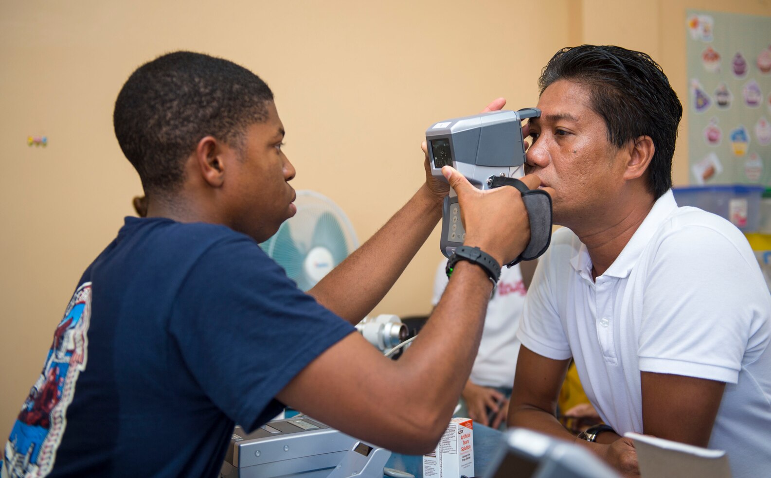 160628-N-BB534-527 LIGAO CITY, Philippines (June 28, 2016) Hospital Corpsman Kyle Quarrie, a native of San Diego, checks a patient's eyes at Ligao West Central Elementary School during Pacific Partnership 2016. Quarrie was at the school as part of a cooperative health engagement where Pacific Partnership 2016 personnel attached to hospital ship USNS Mercy (T-AH 19) and members of the Armed Forces of the Philippines spent the day educating people on health care, hygiene and nutrition. Participants also provided direct care services including optometry, dental care and physical therapy. Pacific Partnership is visiting the Philippines for the seventh time since its first mission in 2006. Partner nations will work side-by-side with local military and non-government organizations to conduct cooperative health engagements, community relation events and subject matter expert exchanges to better prepare for a natural disaster or crisis. (U.S. Navy photo by Mass Communication Specialist 1st Class Elizabeth Merriam/Released)