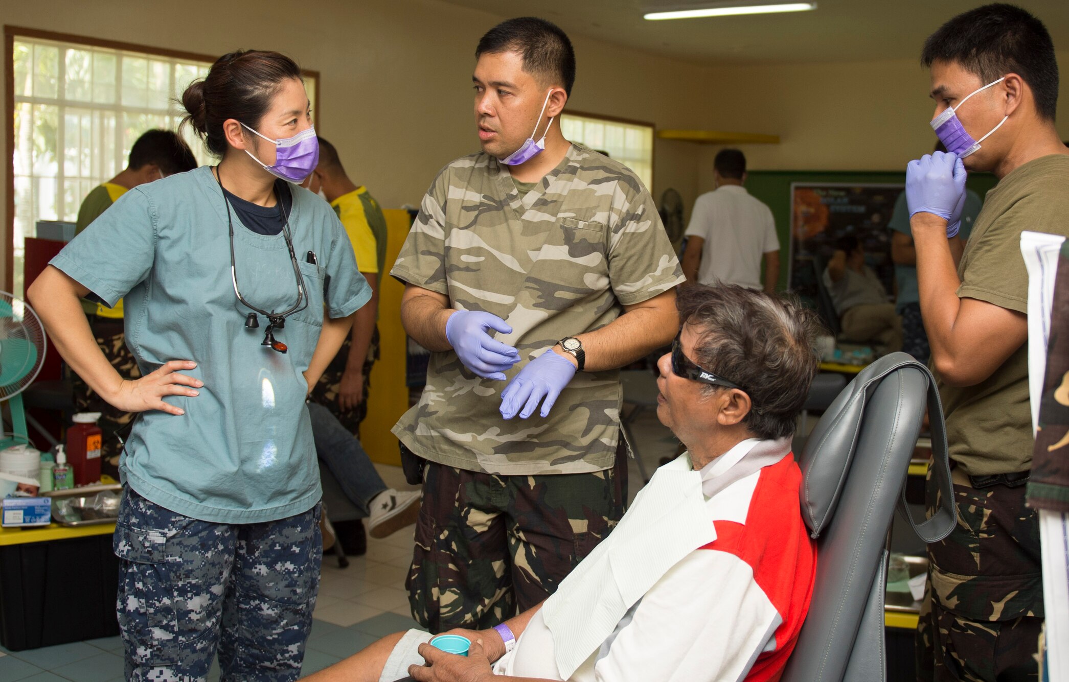 160628-N-BB534-917 LIGAO CITY, Philippines (June 28, 2016) Lt. Gabrielle Jung, a Navy dentist and native of Aurora, Colorado (left), discusses a patients treatment with Dr. Ryan J. Glaraga, at Ligao West Central Elementary School during Pacific Partnership 2016. Jung was at the school as part of a cooperative health engagement where Pacific Partnership 2016 personnel attached to hospital ship USNS Mercy (T-AH 19) and members of the Armed Forces of the Philippines spent the day educating people on health care, hygiene and nutrition. Participants also provided direct care services including optometry, dental care and physical therapy. Pacific Partnership is visiting the Philippines for the seventh time since its first mission in 2006. Partner nations will work side-by-side with local military and non-government organizations to conduct cooperative health engagements, community relation events and subject matter expert exchanges to better prepare for a natural disaster or crisis. (U.S. Navy photo by Mass Communication Specialist 1st Class Elizabeth Merriam/Released)