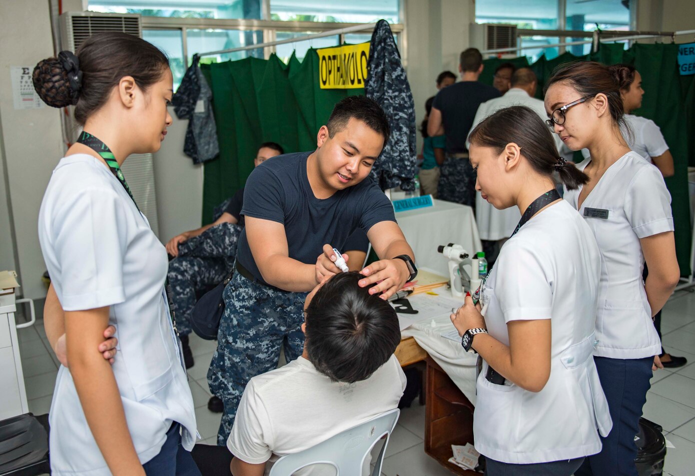 160628-N-SJ730-166 LEGAZPI, Philippines (June 28, 2016) Hospital Corpsman 2nd Class Kenji Bribon, attached to hospital ship USNS Mercy (T-AH 19), works alongside local nursing students in giving a patient eye drops at Bicol Regional Training and Teaching Hospital. At the hospital, Pacific Partnership 2016 personnel worked alongside local physicians, nurses and nursing students to screen patients for surgery aboard Mercy. Pacific Partnership is visiting the Philippines for the seventh time since its first mission in 2006. Partner nations will work side-by-side with local military and non-government organizations to conduct cooperative health engagements, community relations events and subject matter expert exchanges to better prepare for natural disaster or crisis. (U.S. Navy photo by Mass Communication Specialist 2nd Class Hank Gettys/Released)
