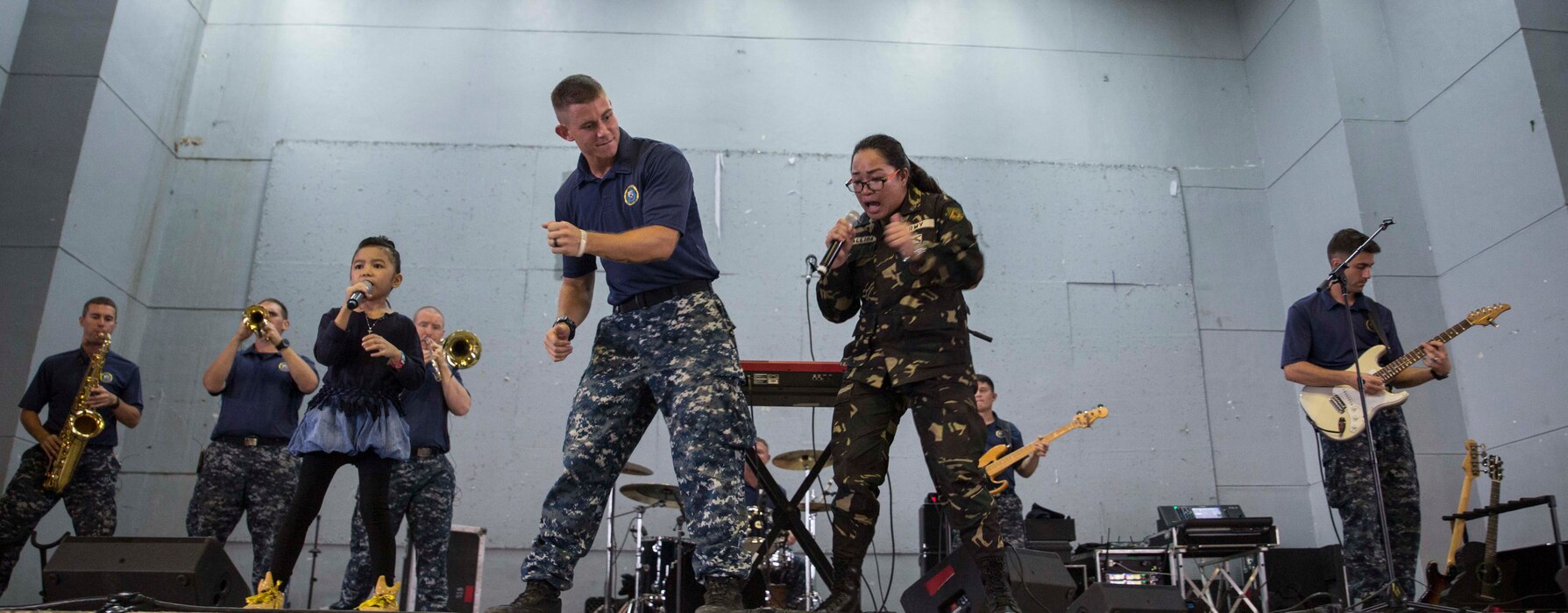 160702-M-TM809-444 LEGAZPI, Philippines (July 2, 2016) Sofia Capili, a 9-year-old Filipino vocalist, sings along side of Musician 3rd Class Steven LaMonica, a native of Dallas and vocalist for the U.S. Pacific Fleet Band, and Pfc. Maria Caballida, a vocalist for the Southern Louzon Command Band, during a community relation event at Albay Astrodome in support of Pacific Partnership 2016. Community relation events provide an opportunity for the local community and Pacific Partnership personnel to enjoy entertainment and share cultural and personal experiences. Pacific Partnership is visiting the Philippines for the seventh time since its first visit in 2006. Partner nations are working side-by-side with local military and non-government organizations to conduct cooperative health engagements, community relation events and subject matter expert exchanges to better prepare for natural disaster or crisis. (U.S. Marine Corps photo by Sgt. Brittney Vella/Released)