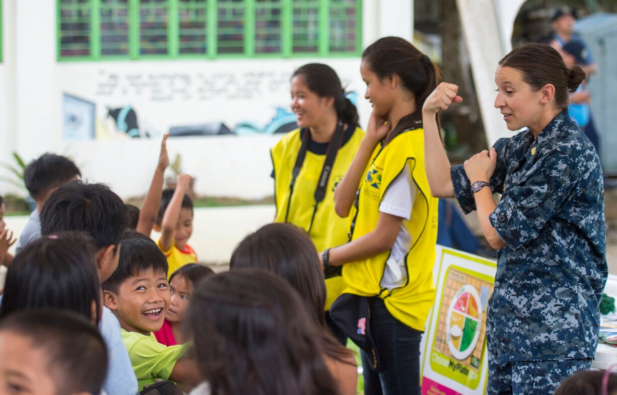 160702-N-BB534-447 DARAGA, Philippines (July 2, 2016) Lt. j.g. Shelby Naughton (right), a dietician assigned to hospital ship USNS Mercy (T-AH 19) teaches a nutrition class to children at Anislag Elementary School, with the help of Trisha Pangan and Aleja Dorosan, volunteers for Latter-Day Saint Charities. The women were at the school as part of a cooperative health engagement where Pacific Partnership 2016 personnel attached to Mercy and members of the Armed Forces of the Philippines spent the day sharing information about health care, hygiene and nutrition. Participants also provided direct care services including optometry, dental care, physical therapy and veterinary care. Pacific Partnership is visiting the Philippines for the seventh time since its first visit in 2006. Partner nations are working side-by-side with local military and non-government organizations to conduct cooperative health engagements, community relation events and subject matter expert exchanges to better prepare for a natural disaster or crisis. (U.S. Navy photo by Mass Communication Specialist 1st Class Elizabeth Merriam/Released)