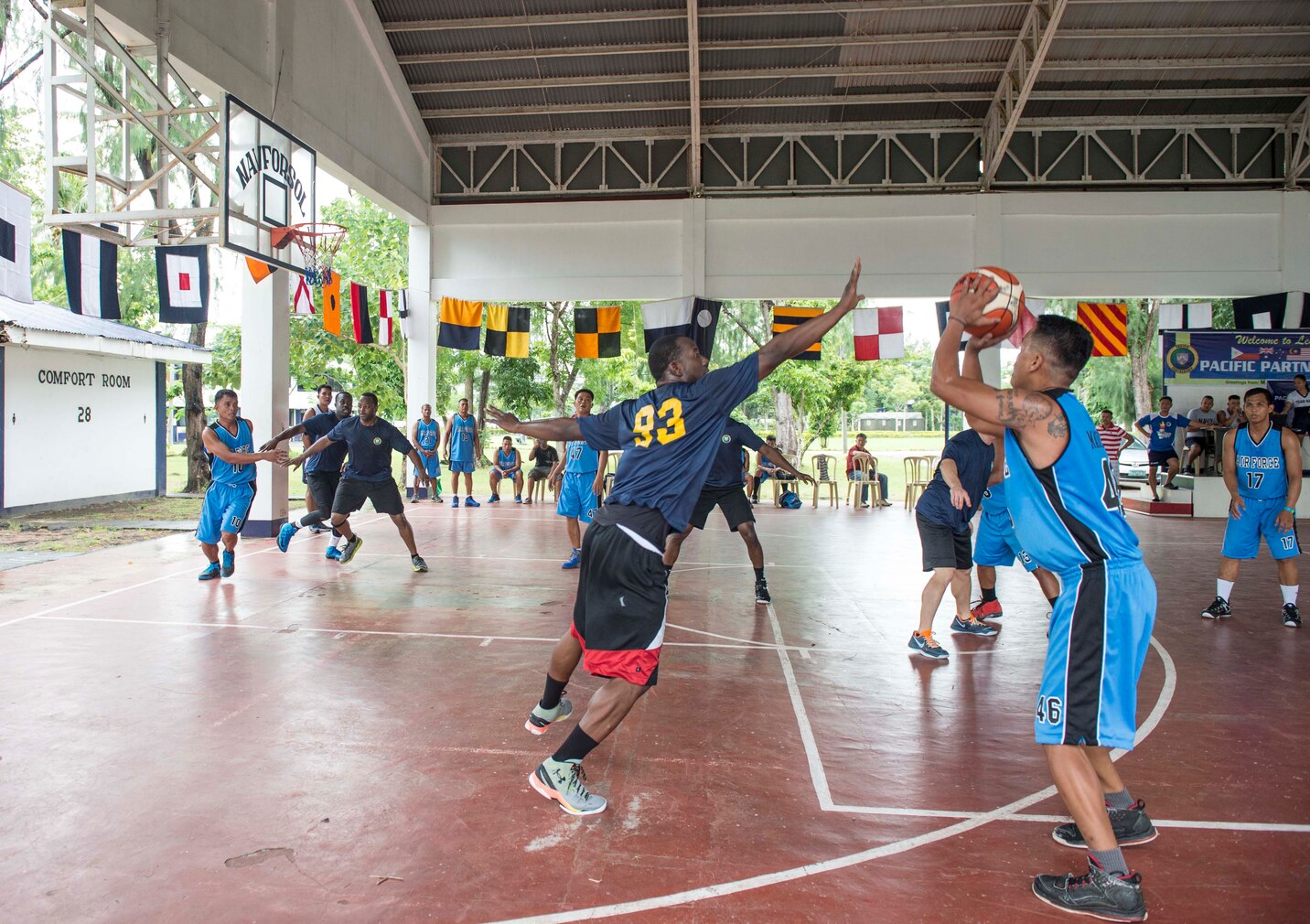 160703-N-SX983-317 LEGAZPI, Philippines (July 3, 2016) Service members attached to hospital ship USNS Mercy (T-AH 19) play a basketball game against Philippine Air Force members at Naval Forces Southern Luzon during a Pacific Partnership 2016 community relation event. Community relation events bring together the local community and Pacific Partnership personnel and are an essential component of the mission. Pacific Partnership is visiting the Philippines for the seventh time since its first visit in 2006. Partner nations are working side-by-side with local military and non-government organizations to conduct cooperative health engagements, community relation events and subject matter expert exchanges to better prepare for natural disaster or crisis. (U.S. Navy photo by Mass Communication Specialist 2nd Class Lindsey E. Skelton/Released)