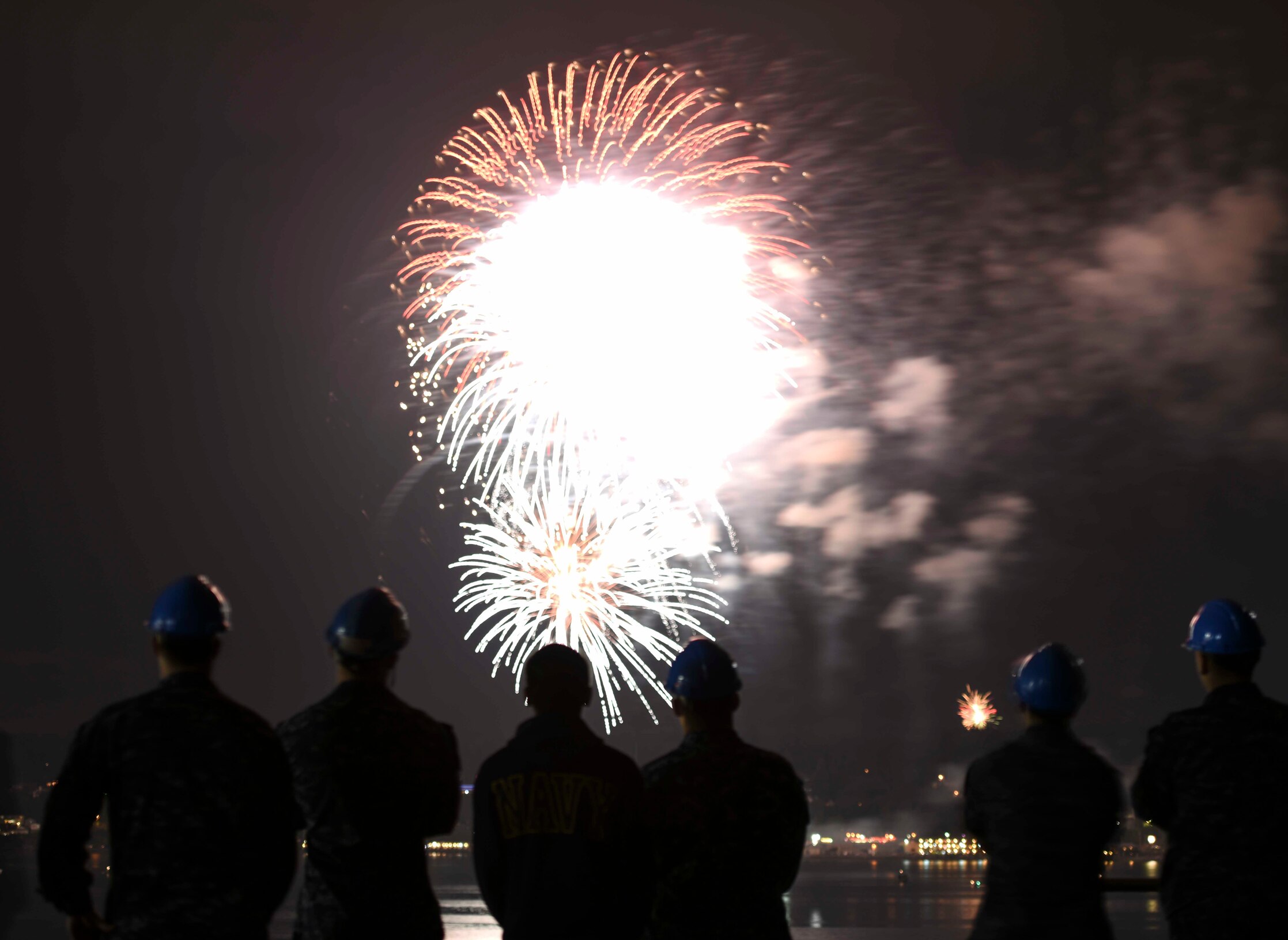 NAVAL BASE KITSAP-BREMERTON, Wash. (July 4, 2016) Sailors observe a fireworks show over the Puget Sound from the flight deck of the aircraft carrier USS Nimitz (CVN 68). Nimitz is currently undergoing an extended planned incremental maintenance availability at Puget Sound Naval Shipyard and Intermediate Maintenance Facility where the ship is receiving scheduled maintenance and upgrades. (U.S. Navy photo by Mass Communication Specialist 3rd Class Deanna C. Gonzales/Released)