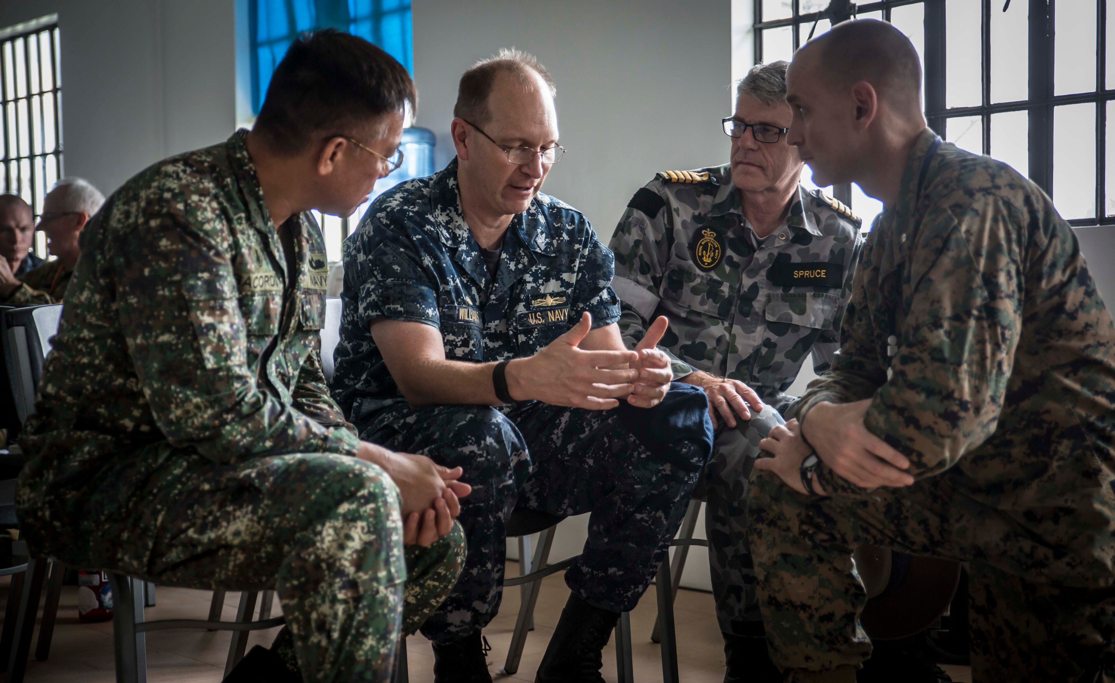 160705-M-TM809-105 LEGAZPI, Philippines (July 05, 2016) U.S. Navy Capt. Tom Williams, mission commander, Pacific Partnership 2016 (center), discusses Humanitarian Assistance Disaster Relief with Filipino representatives during a HADR workshop. During the three-day workshop, co-hosted by the Armed Forces of the Philippines and Pacific Partnership 2016, Filipino civilians and military service members coordinated a tabletop exercise to simulate multilateral disaster response among partners during a crisis. Pacific Partnership is visiting the Philippines for the seventh time since its first visit in 2006. Partner nations are working side-by-side with local military and non-government organizations to conduct cooperative health engagements, community relation events and subject matter expert exchanges to better prepare for a natural disaster or crisis. (U.S. Marine Corps photo by Sgt. Brittney Vella/Released)