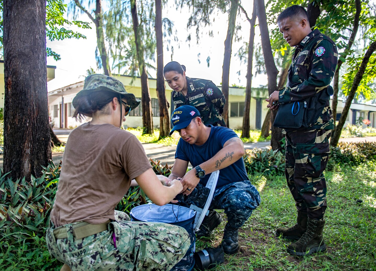 160705-N-SJ730-037 NAVAL STATION JULHASAN ARASAIN, Philippine (July 5, 2016) U.S. Navy Lt. Jen Knapp (left), an entomologist and native of Aqua Dolce, California, and Hospital Corpsman 2nd Class Anderson Amador (middle), a native of Brooklyn, New York, both embarked aboard hospital ship USNS Mercy (T-AH 19), demonstrate how to assemble a mosquito trap to members of the Armed Forces of the Philippines during a preventative medicine subject matter expert exchange during Pacific Partnership 2016. During the exchange, U.S. and Filipino personnel shared their preventative medicine experience and expertise to gain knowledge and perspective in the field. Pacific Partnership is visiting the Philippines for the seventh time since its first visit in 2006. Partner nations are working side-by-side with local military and non-government organizations to conduct cooperative health engagements, community relations events and subject matter expert exchanges to better prepare for natural disaster or crisis. (U.S. Navy photo by Mass Communication Specialist 2nd Class Hank Gettys/Released)