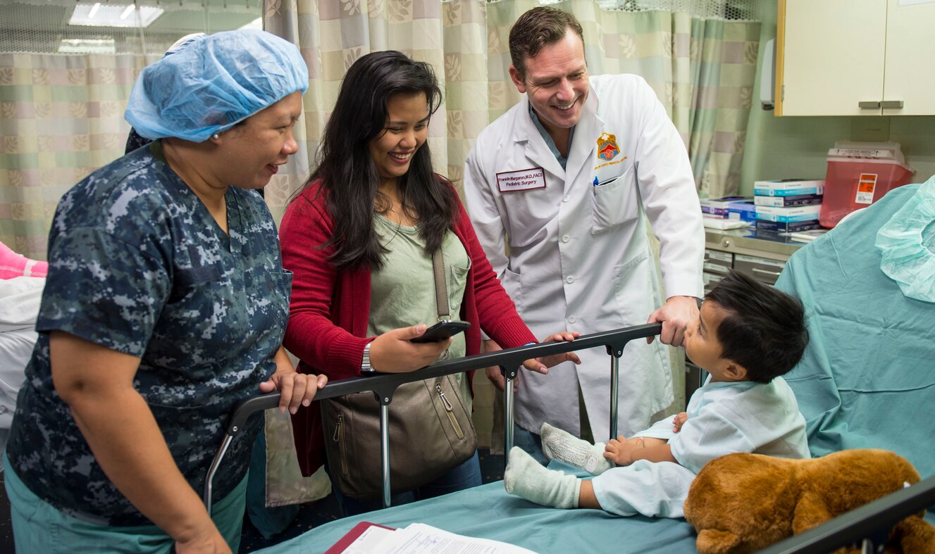 160706-N-BB534-055 LEGAZPI CITY, Philippines (July 6, 2016) Major Gina B Burac (left), Nurse Corps and U.S. Navy Lt. Cmdr. Franklin Margaron, pediatric surgeon, interact with a patient and his mother before surgery aboard hospital ship USNS Mercy (T-AH 19) during Pacific Partnership 2016. Members of the Armed Forces of the Philippines, partner nations and Mercy crew worked together to provide patient care during the surgery. Pacific Partnership is visiting the Philippines for the seventh time since its first visit in 2006. Partner nations are working side-by-side with local military and non-government organizations to conduct cooperative health engagements, community relation events and subject matter expert exchanges to better prepare for a natural disaster or crisis. (U.S. Navy photo by Mass Communication Specialist 1st Class Elizabeth Merriam/Released)