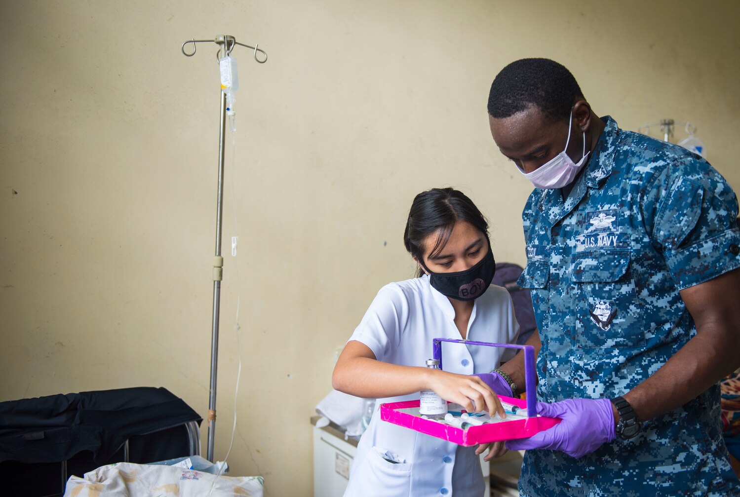160707-N-BB534-548 Ligao City, Philippines (July 7, 2016) Lean Nebres (left), registered nurse and Hospital Corpsman 2nd Class Michael Cox distribute medication together at Josefina Belmonte Duran Memorial District Hospital during a Pacific Partnership 2016 subject matter expert exchange. During the exchange, Pacific Partnership personnel attached to Mercy and members of the Armed Forces of the Philippines worked with hospital staff to enhance medical knowledge and increase patient-based care. Pacific Partnership is visiting the Philippines for the seventh time since its first visit in 2006. Partner nations are working side-by-side with local military and non-government organizations to conduct cooperative health engagements, community relation events and subject matter expert exchanges to better prepare for a natural disaster or crisis. (U.S. Navy photo by Mass Communication Specialist 1st Class Elizabeth Merriam/Released)