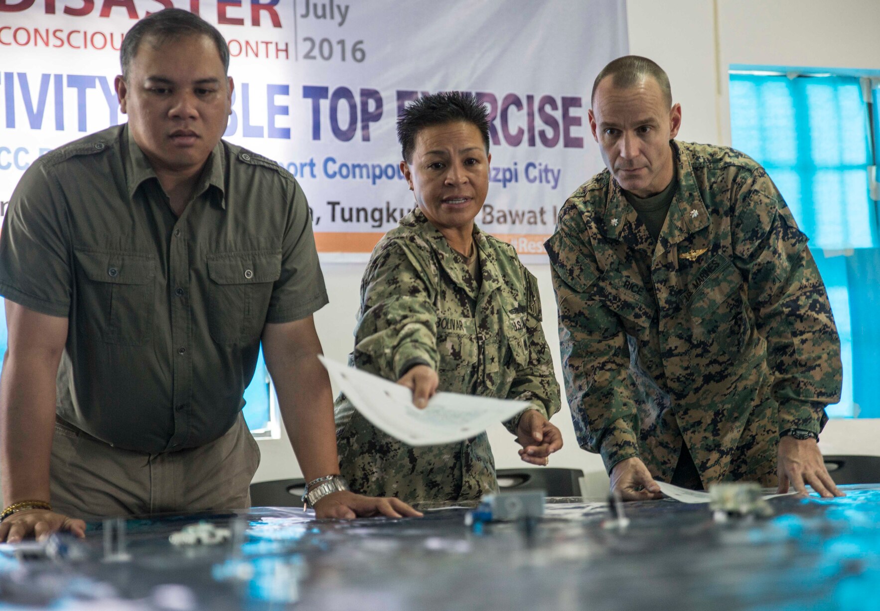 160708-M-TM809-062 LEGAZPI, Philippines (July 8, 2016) Bernardo R. Alejandro IV, regional director, Office of Civil Defense 5, U.S. Navy Rear Adm. Babette Bolivar, commander, Joint Region Marianas and Lt. Col. Andrew Rice, Pacific Partnership 2016 deputy chief of staff, discuss scenarios during a humanitarian assistance disaster relief tabletop exercise at the Disaster Coordination Center, Legazpi Airport, in support of Pacific Partnership 2016. The three-day workshop, co-hosted by the Armed Forces of the Philippines and Pacific Partnership 2016, included Filipino civilians and U.S., New Zealand and Australian service members. Pacific Partnership is visiting the Philippines for the seventh time since its first visit in 2006. (U.S. Marine Corps photo by Sgt. Brittney Vella/Released)