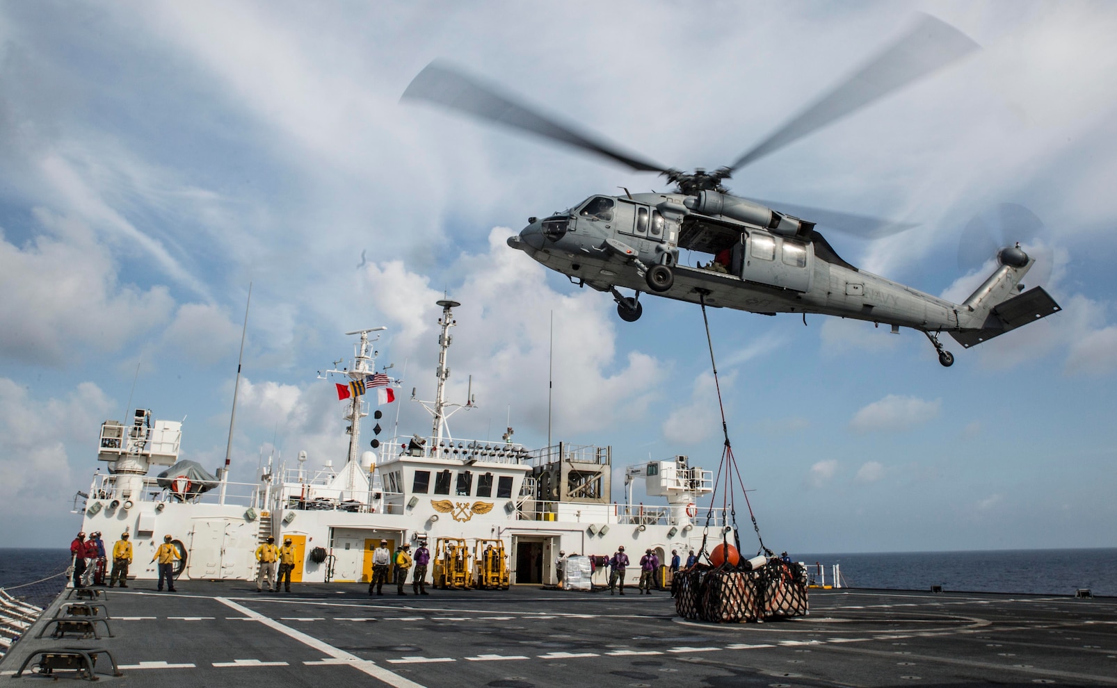 160713-M-TM809-126 SOUTH CHINA SEA (July 13, 2016) An MH-60S sea hawk helicopter assigned to the “Island Knights” of Helicopter Sea Combat (HSC) Squadron 25 approaches the flight deck of hospital ship USNS Mercy (T-AH 19) during a vertical replenishment. Mercy, which is deployed in support of Pacific Partnership 2016, is en route to its third mission stop in Da Nang, Vietnam. Upon arrival, partner nations will work side-by-side with local military and non-government organizations to conduct cooperative health engagements, community relation events and subject matter expert exchanges to better prepare for a natural disaster or crisis. (U.S. Marine Corps photo by Sgt. Brittney Vella/Released)