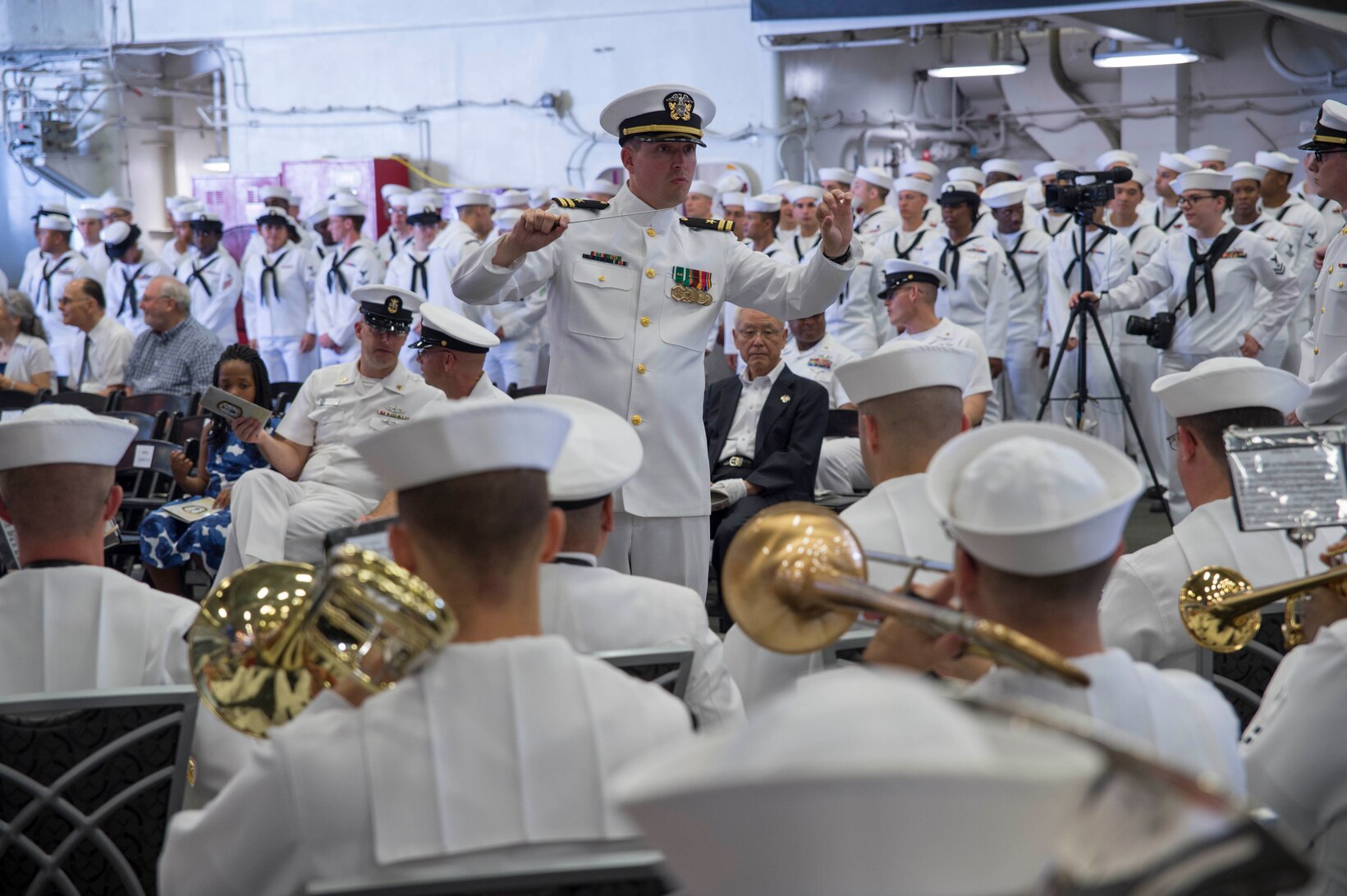 160803-N-XK809-145 SASEBO, Japan (August 3, 2016) - The U.S. Navy 7th Fleet Band plays during a change of command ceremony in the hangar bay of amphibious assault ship USS Bonhomme Richard (LHD 6). During the ceremony, Rear Adm. John B. Nowell relinquished command of Expeditionary Strike Group (ESG) 7 to Rear Adm. Marc H. Dalton. (U.S. Navy photo by Mass Communication Specialist 3rd Class William Sykes/Released)