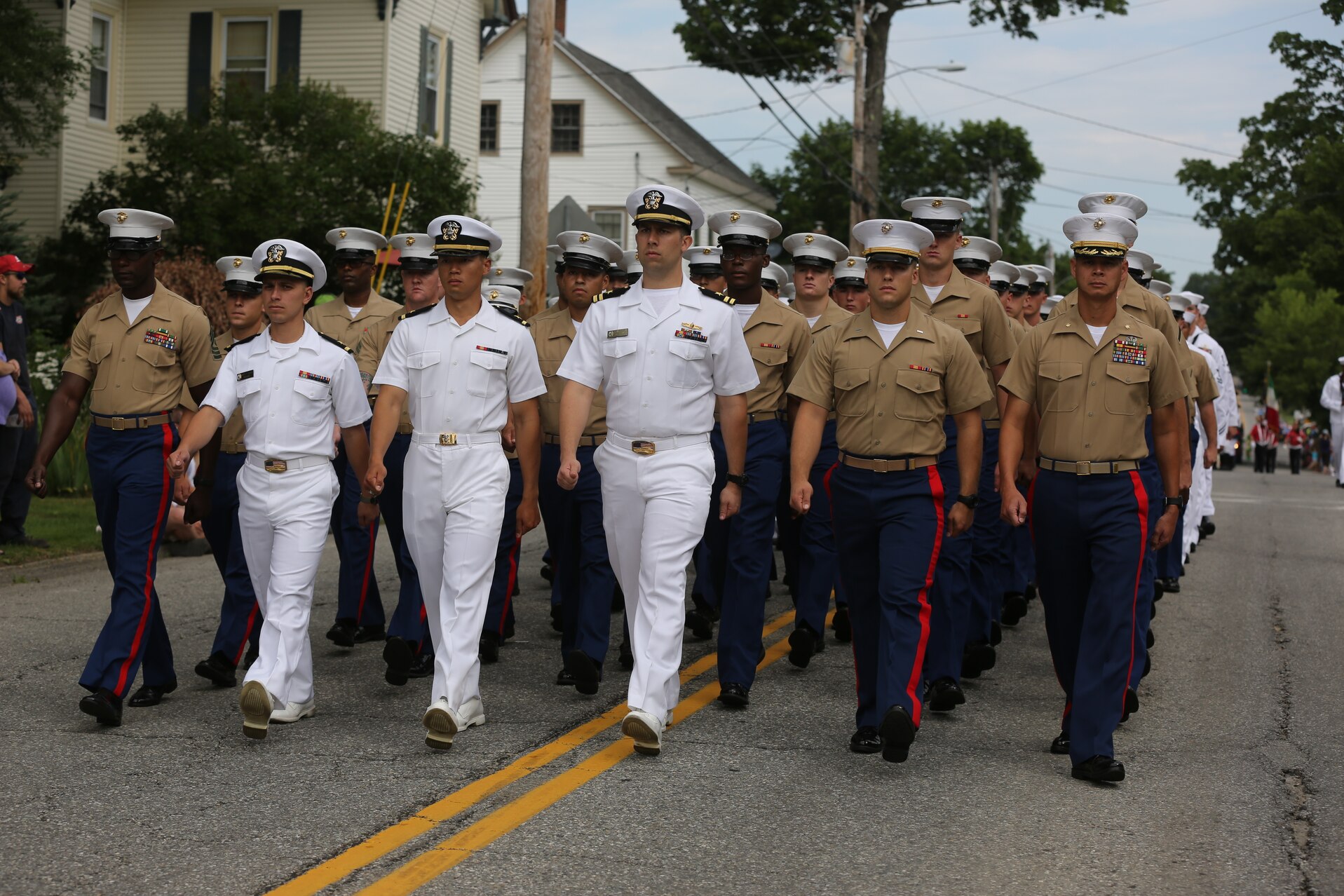 Marines and sailors aboard the USS Oak Hill (LSD-51) march through the streets of Rockland, ME, during the Lobster Fest parade Aug. 6, 2016. Marines and sailors with Combat Logistics Battalion 8, 2nd Marine Logistics Group, aboard the Oak Hill, anchored in Rockland, Aug. 3-7, to display the expeditionary capabilities of the Navy-Marine Corps team during Rockland’s Lobster Fest. The unit presented vehicles and weapons for public tours aboard the Navy LSD and participated in the city’s annual parade and events at the local American Legion Hall. (U.S. Marine Corps photo by Sgt. Olivia McDonald)