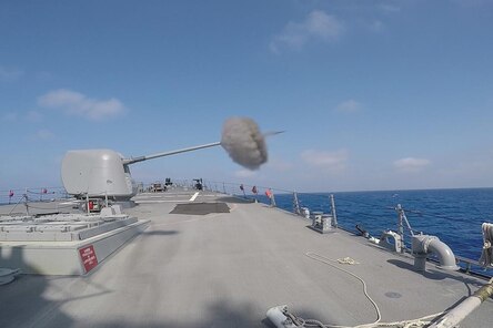 160807-N-ZE250-239 MEDITERRANEAN SEA (Aug. 7, 2016) USS Carney (DDG 64) fires its MK 45 5-inch lightweight gun during a live fire exercise while on patrol in the Mediterranean Sea. Carney, an Arleigh Burke-class guided-missile destroyer, forward-deployed to Rota, Spain, is conducting a routine patrol in the U.S. 6th fleet area of operations in support of U.S. national security interests in Europe. (U.S. Navy photo by Mass Communication Specialist 3rd Class Weston Jones/Released)