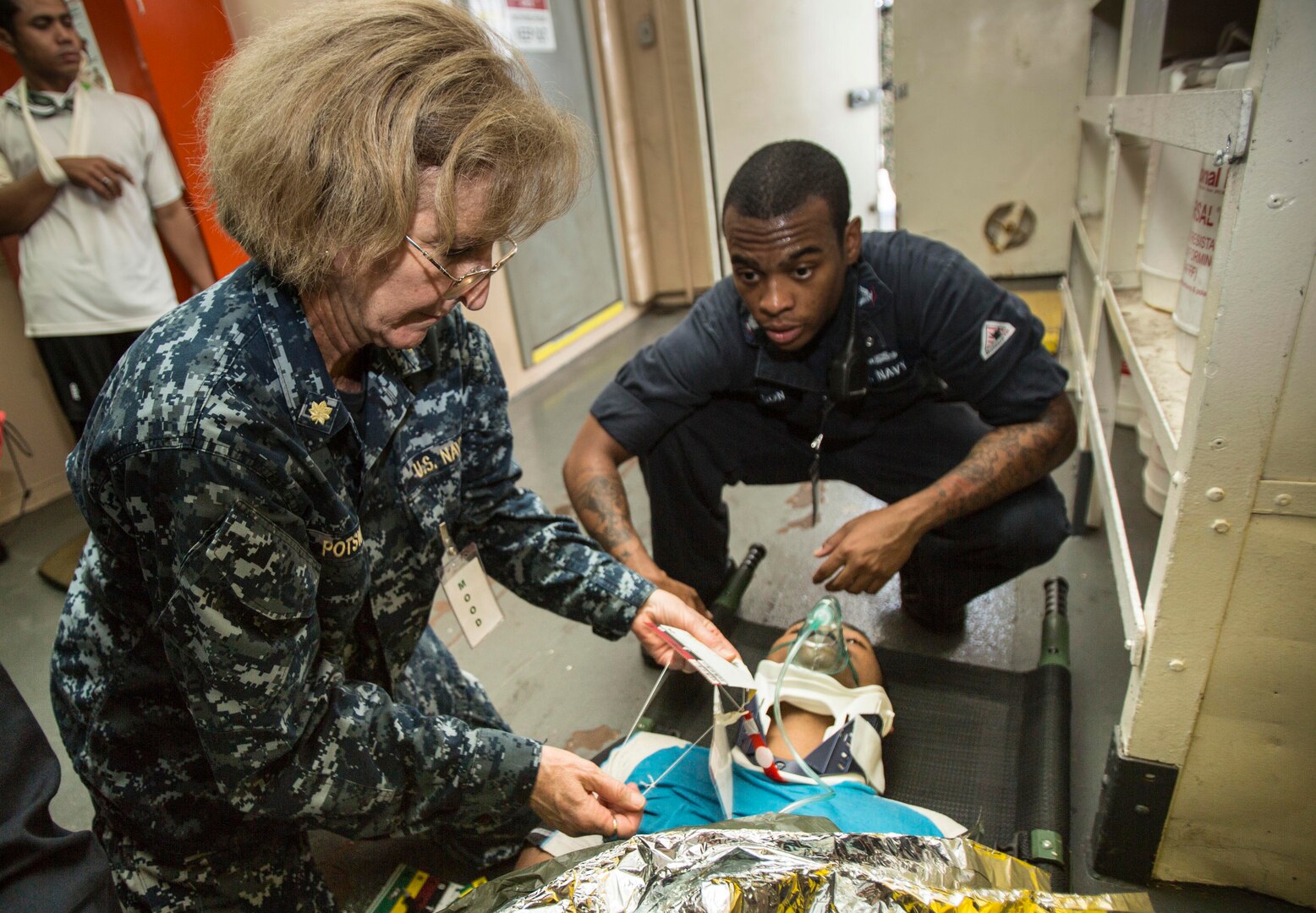 160814-M-TM809-043 KUANTAN, Malaysia (Aug. 14, 2016) Lt. Cmdr. Lynda Potswald, a nurse practitioner from Los Angeles, and Hospital Corpsman 3rd Class Robert Roberson, from Miami, assess a simulated patient aboard hospital ship USNS Mercy (T-AH 19) during a Pacific Partnership 2016 search and rescue exercise. During the exercise, Pacific Partnership and Malaysian Armed Forces personnel worked together to respond to a simulated maritime distress call resulting from a typhoon. The event concluded Pacific Partnership’s mission stop in Kuantan, Malaysia. Mercy is en route to its final mission stop in Padang, Indonesia. Upon arrival, partner nations will work side-by-side with local military and non-government organizations to conduct cooperative health engagements, community relation events, subject matter expert exchanges and a SAR exercise to better prepare for natural disaster or crisis (U.S. Marine Corps photo by Sgt. Brittney Vella/Released)