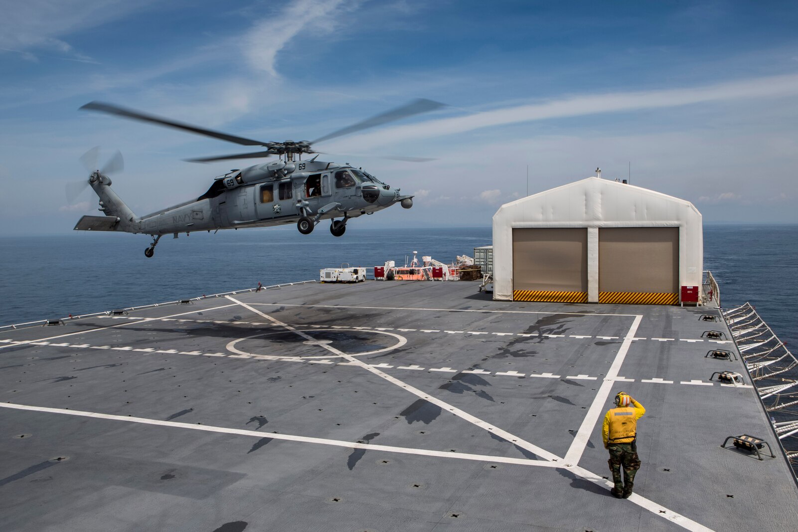 160814-N-CV785-033 KUANTAN, Malaysia (Aug. 14, 2016) A U.S. Navy MH-60S Seahawk helicopter from Helicopter Sea Combat (HSC) Squadron 21, takes off from USNS Mercy (T-AH 19) during a Pacific Partnership 2016 search and rescue exercise. During the exercise Pacific Partnership and Malaysian Armed Forces personnel worked together to respond to a simulated maritime distress call resulting from a typhoon. The event concluded Pacific Partnership’s mission stop in Kuantan, Malaysia. Mercy is en route to its final mission stop in Padang, Indonesia. Upon arrival, partner nations will work side-by-side with local military and non-government organizations to conduct cooperative health engagements, community relation events, subject matter expert exchanges and a SAR exercise to better prepare for natural disaster or crisis. (Royal Australian Air Force photo by Air Force Imagery Specialist CPL David Cotton/ Released)