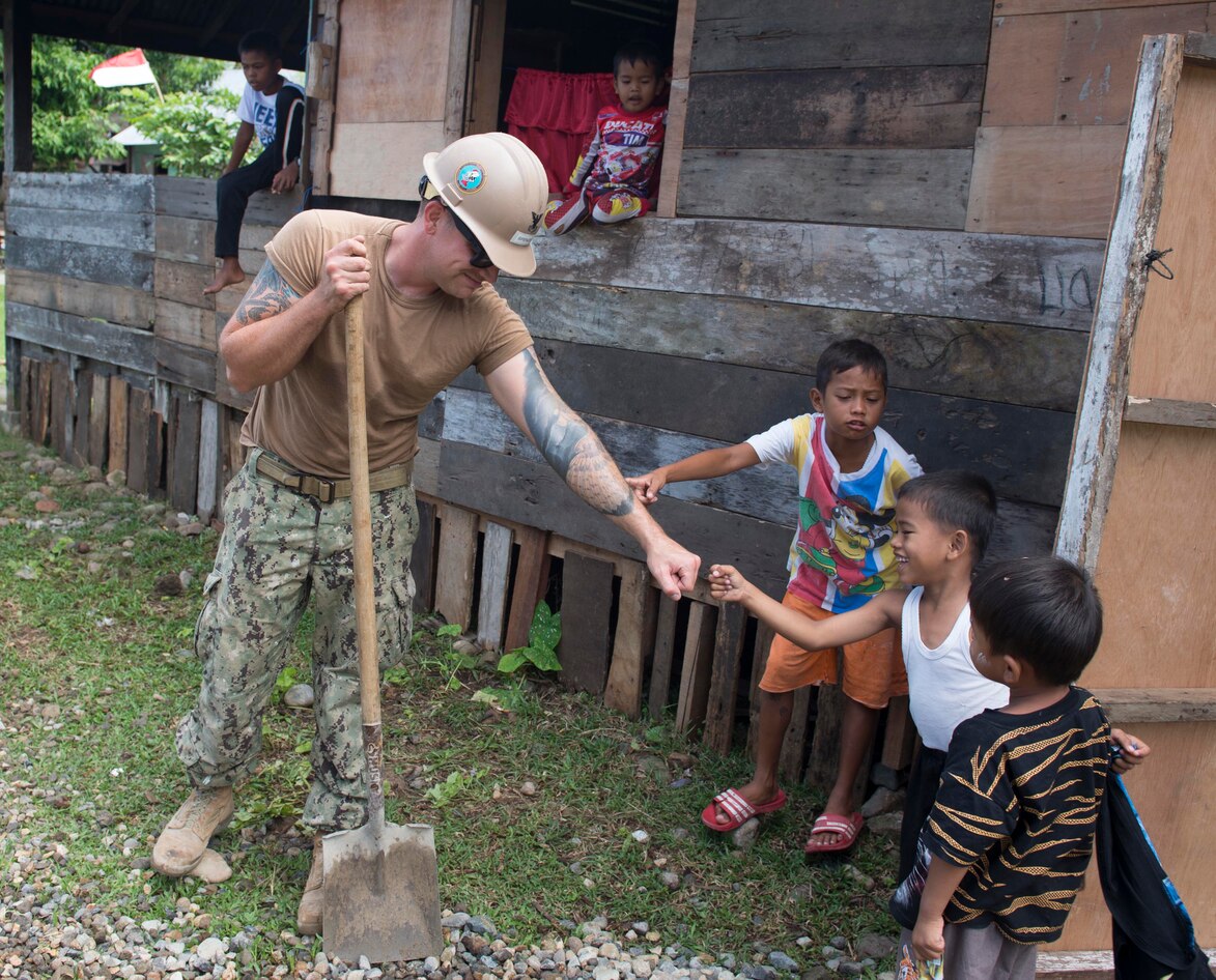 160820-N-SX983-190 SUNGAI PINANG, Indonesia (Aug. 20, 2016) Builder 2nd Class Matthew Spence, from Chicago, attached to Amphibious Construction Battalion One, fist-bumps a local child near a construction site in Sungai Pinang. U.S. Navy Seabees attached to ACB 1, Naval Mobile Construction Battalion Four, and Tentara Nasional Indonesia Marines are working together to build a new public restroom in Sungai Pinang during Pacific Partnership 2016. This is the fifth time Pacific Partnership has visited Indonesia. Partner nations are working side-by-side with local organizations during disaster response training, civil engineering projects, Women, Peace, and Security seminars, medical subject matter expert exchanges and a live field training exercise aimed at improving the capacity of local government, civilian agencies and partner militaries to collectively respond in crisis. (U.S. Navy photo by Mass Communication Specialist 2nd Class Lindsey E. Skelton/Released)