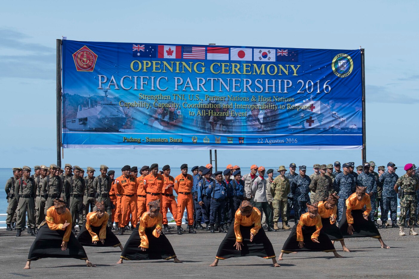 160822-N-CV785-237 PADANG, Indonesia (Aug. 22, 2016) Traditional Indonesian dancers perform at the Pacifc Partnership 2016 opening ceremony. This is the fifth time Pacific Partnership has visited Indonesia. Partner nations are working side-by-side with local organizations during disaster response training, civil engineering projects, Women, Peace, and Security seminars, medical subject matter expert exchanges and a live field training exercise aimed at improving the capacity of local government, civilian agencies and partner militaries to collectively respond in crisis. (University of California-San Diego Predental Society photo by Ted Wendel/Released)