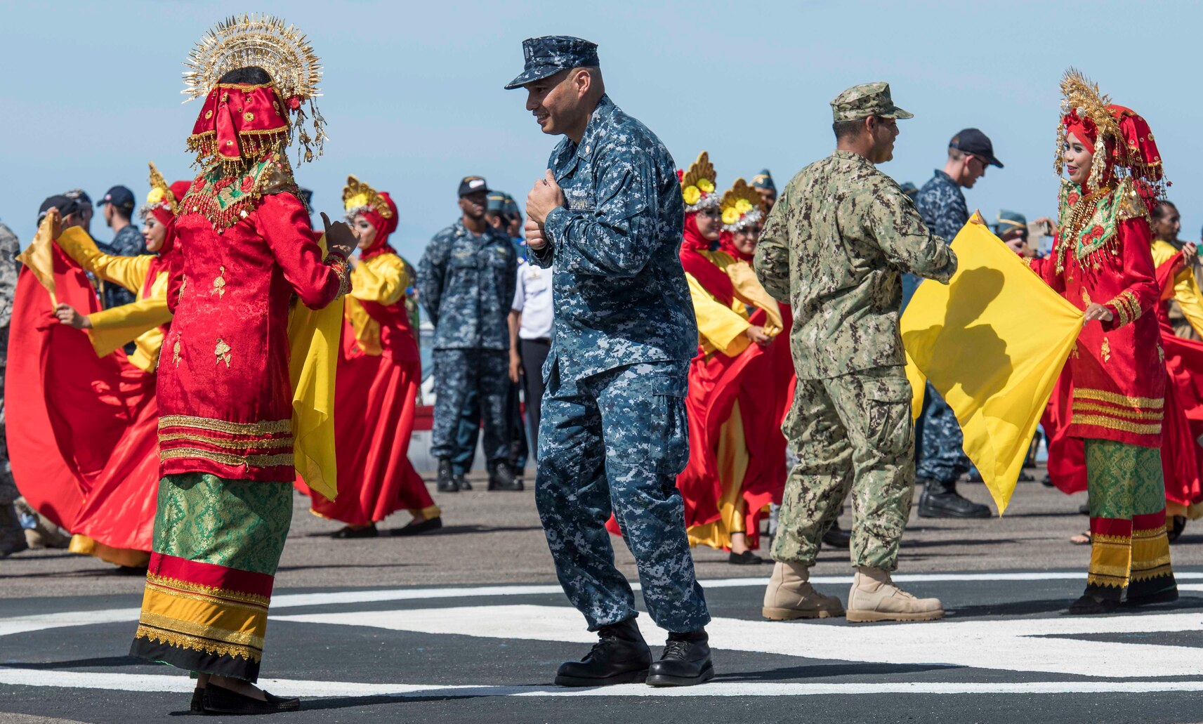160822-N-CV785-374 PADANG, Indonesia (Aug. 22, 2016) Lt Lening Mora and Hospital Corpsman 1st class Carlos Rocha, both assigned to the USNS Mercy (T-AH 19), join traditional Indonesian dancers during the Pacific Partnership 2016 opening ceremony. This is the fifth time Pacific Partnership has visited Indonesia. Partner nations are working side-by-side with local organizations during disaster response training, civil engineering projects, Women, Peace, and Security seminars, medical subject matter expert exchanges and a live field training exercise aimed at improving the capacity of local government, civilian agencies and partner militaries to collectively respond in crisis. (University of California-San Diego Predental Society photo by Ted Wendel/Released)