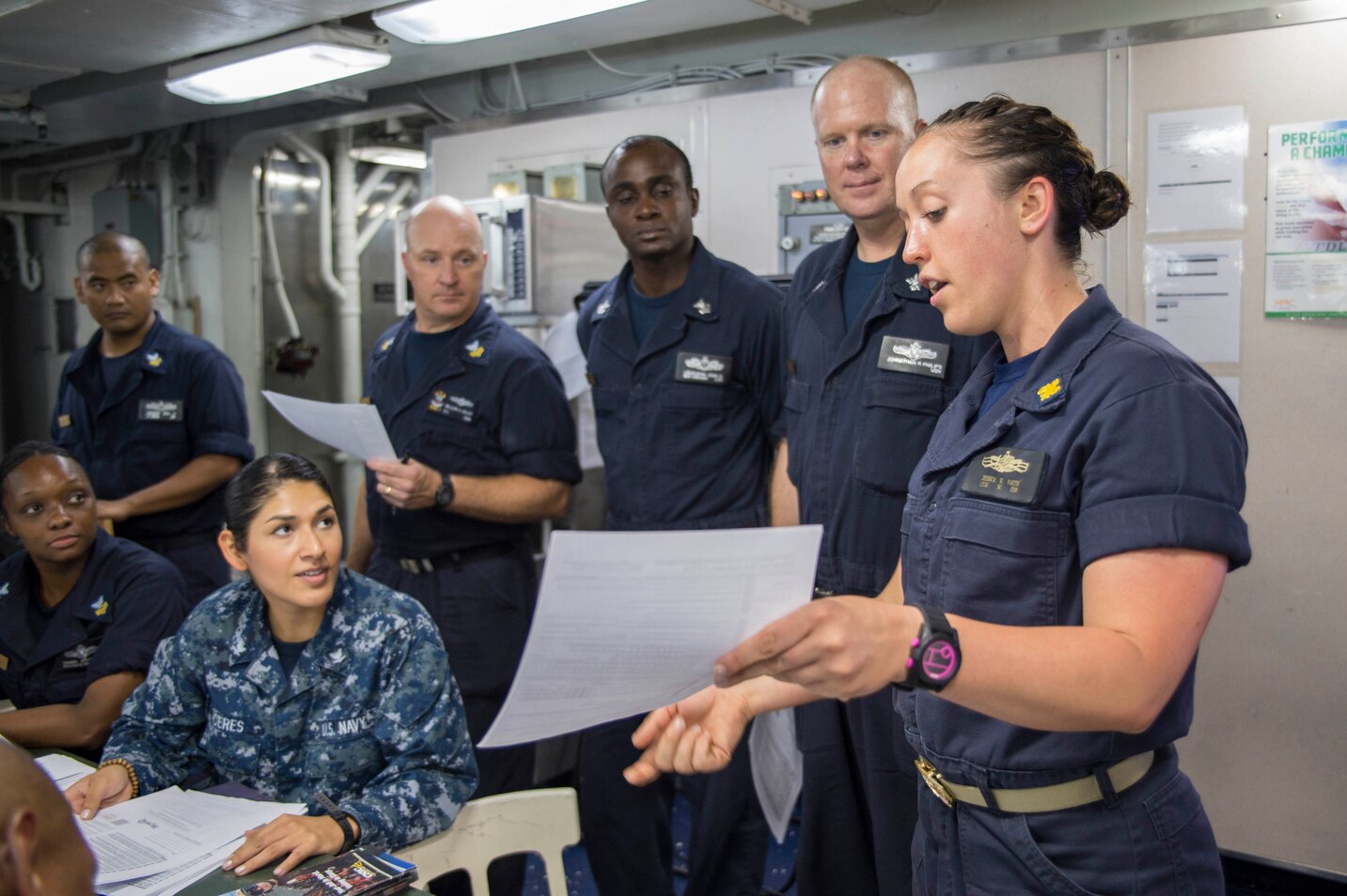 160826-N-TH560-459 EAST CHINA SEA (Aug. 26, 2016) Lt. j.g. Jessica Vaeth (right), voting assistance officer of amphibious assault ship USS Bonhomme Richard (LHD 6), explains how to register for an absentee ballot request following a Women’s Equality Day celebration. Bonhomme Richard, flagship of the Bonhomme Richard Expeditionary Strike Group, is operating in the U.S. 7th Fleet area of operations in support of security and stability in the Indo-Asia-Pacific region. (U.S. Navy photo by Mass Communication Specialist 3rd Class Jeanette Mullinax/Released)