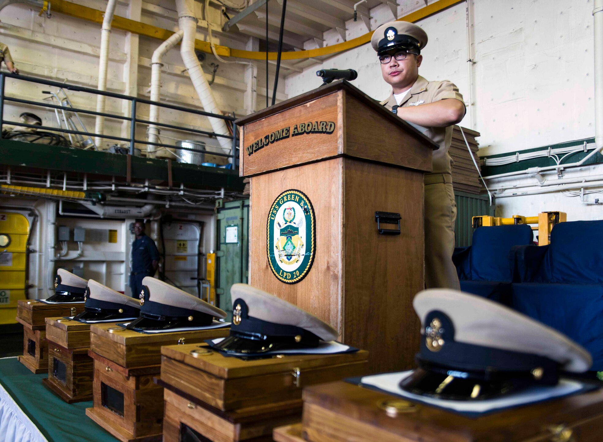 160916-N-JH293-002 PHILIPPINE SEA (Sept. 16, 2016) Chief Cryptologic Technician (Technical) Jericho Alaras delivers remarks during a chief petty officer pinning ceremony aboard the amphibious transport dock ship USS Green Bay (LPD 20). Green Bay, part of the Bonhomme Richard Expeditionary Strike Group, is operating in the Philippine Sea in support of security and stability in the Indo-Asia-Pacific region. (U.S. Navy photo by Mass Communication Specialist 1st Class Chris Williamson/Released)
