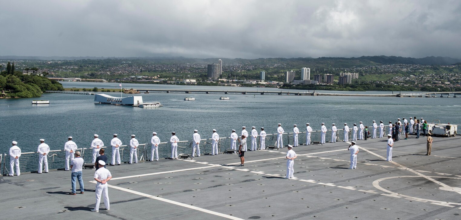 160922-N-TR165-102 PEARL HARBOR, Hawaii (Sept. 22, 2016) Sailors and Tiger Cruise participants aboard hospital ship USNS Mercy (T-AH 19) man the rails as Mercy departs Joint Base Pearl Harbor-Hickam. Tiger Cruise is an underway that gives friends and family of embarked Mercy personnel an opportunity to experience life at sea. Pacific Partnership 2016 deployed in May, embarked aboard Mercy, visiting six ports, during which civilian and military personnel from 14 partner nations worked together, exchanging knowledge and best practices in order to improve collective disaster response preparedness in the Indo-Asia-Pacific region. Upon departure from Hawaii, Mercy, with the embarked Pacific Partnership 2016 team, will sail to her homeport of San Diego. (U.S. Navy photo by Mass Communication Specialist 2nd Class William Cousins/Released)