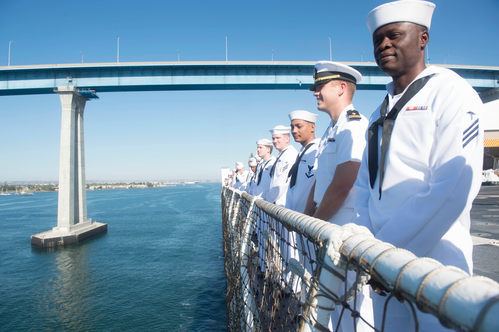 160930-N-SX983-106 SAN DIEGO (Sept. 30, 2016) Service members aboard hospital ship USNS Mercy (T-AH 19) man the rails as Mercy returns to her homeport at Naval Base San Diego after returning from Pacific Partnership 2016. Pacific Partnership deployed in May, visiting six ports, during which civilian and military personnel from 14 partner nations worked together, exchanging knowledge and best practices in order to improve collective disaster response preparedness in the Indo-Asia-Pacific region. (U.S. Navy photo by Petty Officer 2nd Class Lindsey E. Skelton/Released)