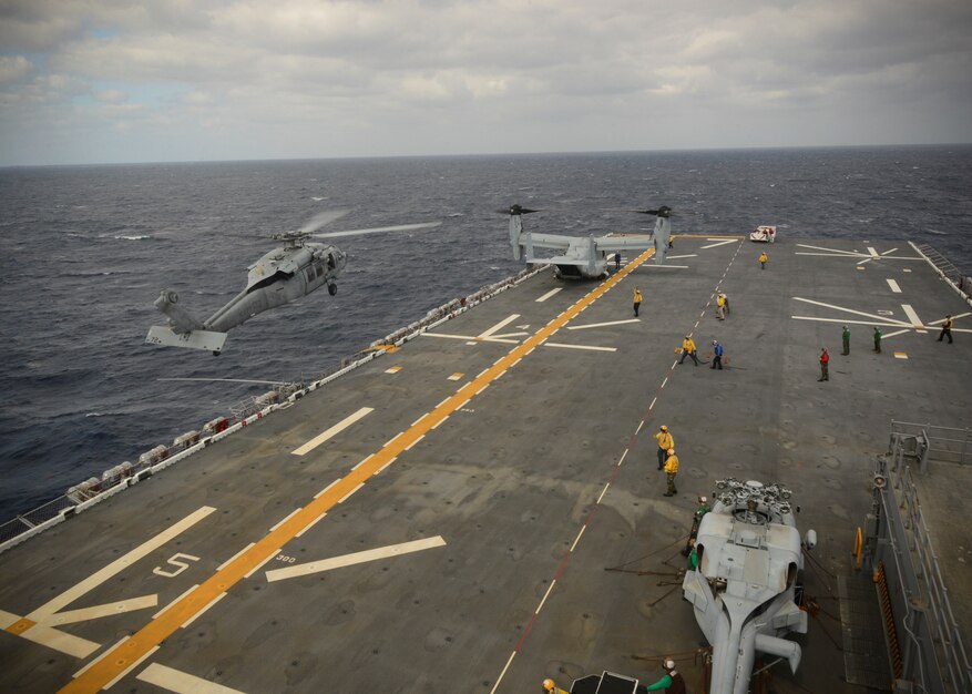 ATLANTIC OCEAN (Oct. 10, 2016) – An MH-60S Knighthawk, assigned to Helicopter Sea Combat Squadron 22, takes off from the flight deck of amphibious assault ship USS Iwo Jima (LHD 7). Iwo Jima and the 24th Marine Expeditionary Unit are preparing to provide disaster relief and humanitarian aid to Haiti following Hurricane Matthew. (U.S. Navy photo by Petty Officer 3rd Class Jess E. Toner/Released)