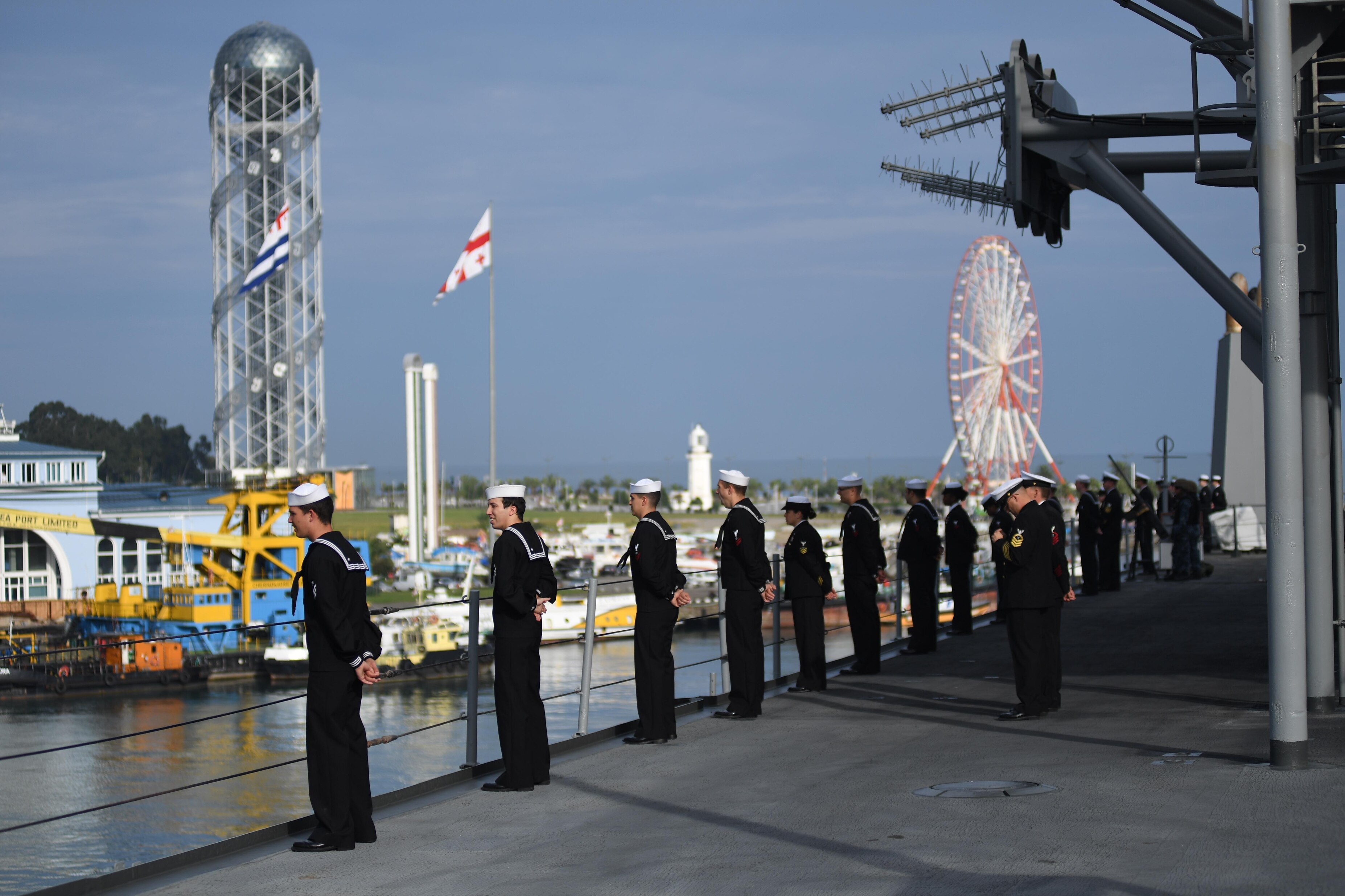 161012-N-JI086-049 - BATUMI, Georgia (Oct. 12, 2016) Sailors aboard the U.S. 6th Fleet command and control ship USS Mount Whitney (LCC 20) man the rails as the ship arrives in Batumi, Georgia for a scheduled port visit Oct. 12, 2016. Mount Whitney is underway conducting naval operations in the U.S. 6th Fleet area of operations to engage with key allies and partners in the region. (U.S. Navy photo by Seaman Ford Williams/Released)