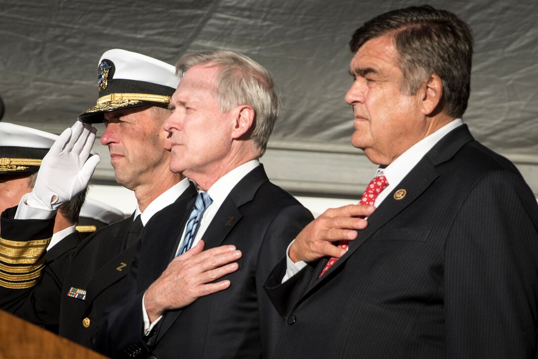 161016-N-AT895-028 BALTIMORE (Oct. 16, 2016) (Left to right) Chief of Naval Operations (CNO) Adm. John Richardson, Secretary of the Navy (SECNAV) Ray Mabus and U.S. Rep. Dutch Ruppersberger of Maryland render honors for the national anthem during the commissioning ceremony for the Navy's newest and most technologically advanced warship, USS Zumwalt (DDG 1000). (U.S. Navy photo by Petty Officer 1st Class Nathan Laird/Released)