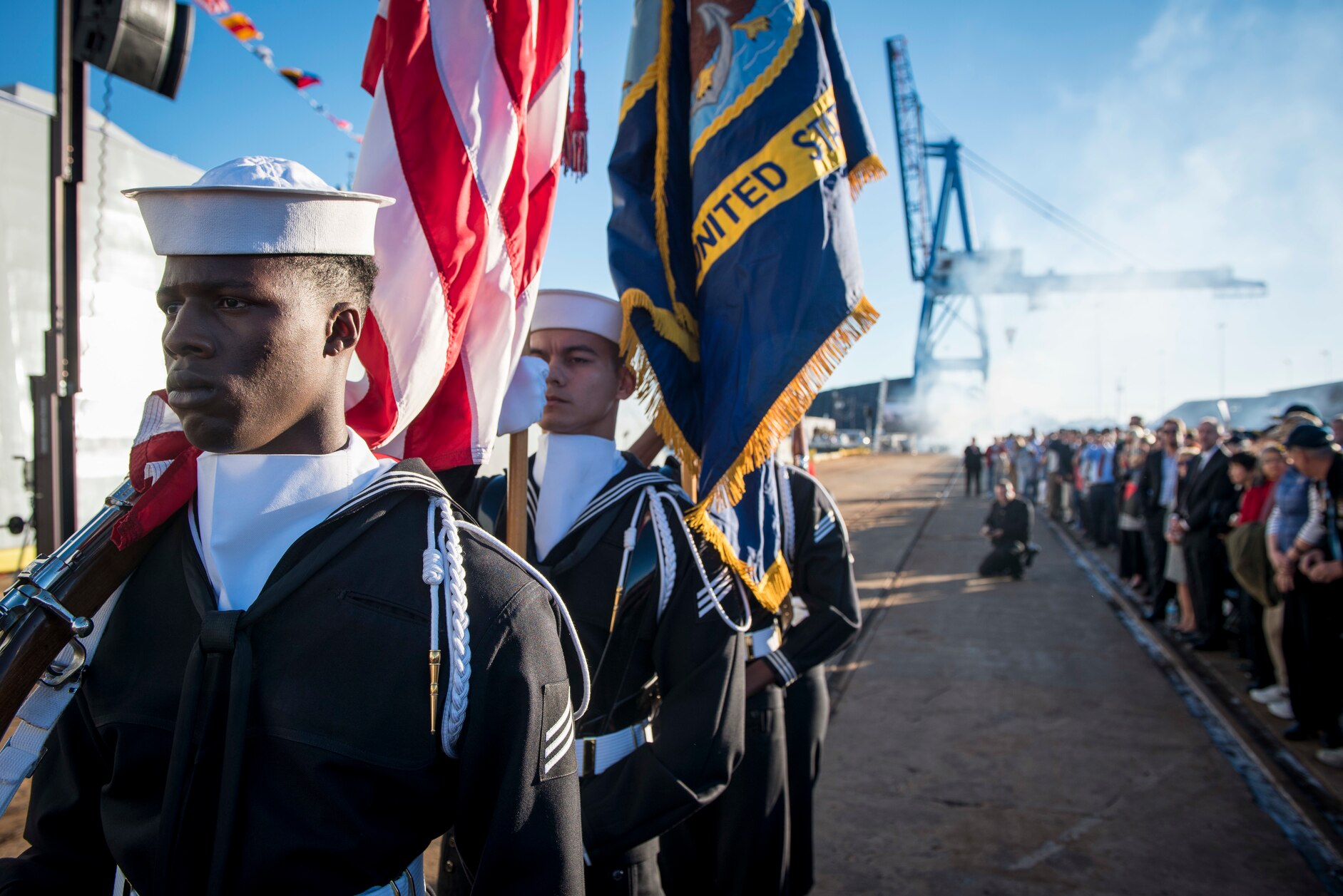 161015-N-AT895-366 BALTIMORE (Oct. 15, 2016) The color guard prepares to parade the colors during the commissioning ceremony for the Navy's newest and most technologically advanced warship, USS Zumwalt (DDG 1000). (U.S. Navy photo by Petty Officer 1st Class Nathan Laird/Released)