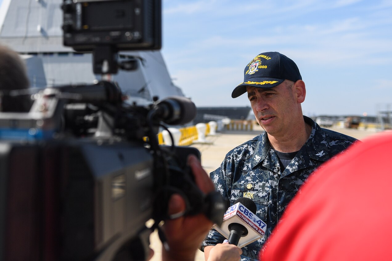 161025-N-TP832-010 JACKSONVILLE, Fla. (October 25, 2016) Capt. James Kirk, commanding officer of USS Zumwalt (DDG 1000), speaks with local media on a pier at Naval Station Mayport. Crewed by 147 Sailors, Zumwalt is the lead ship of a class of next-generation destroyers designed to strengthen naval power by performing critical missions and enhancing U.S. deterrence, power projection and sea control objectives. (U.S. Navy photo by Seaman Michael Lopez/Released)