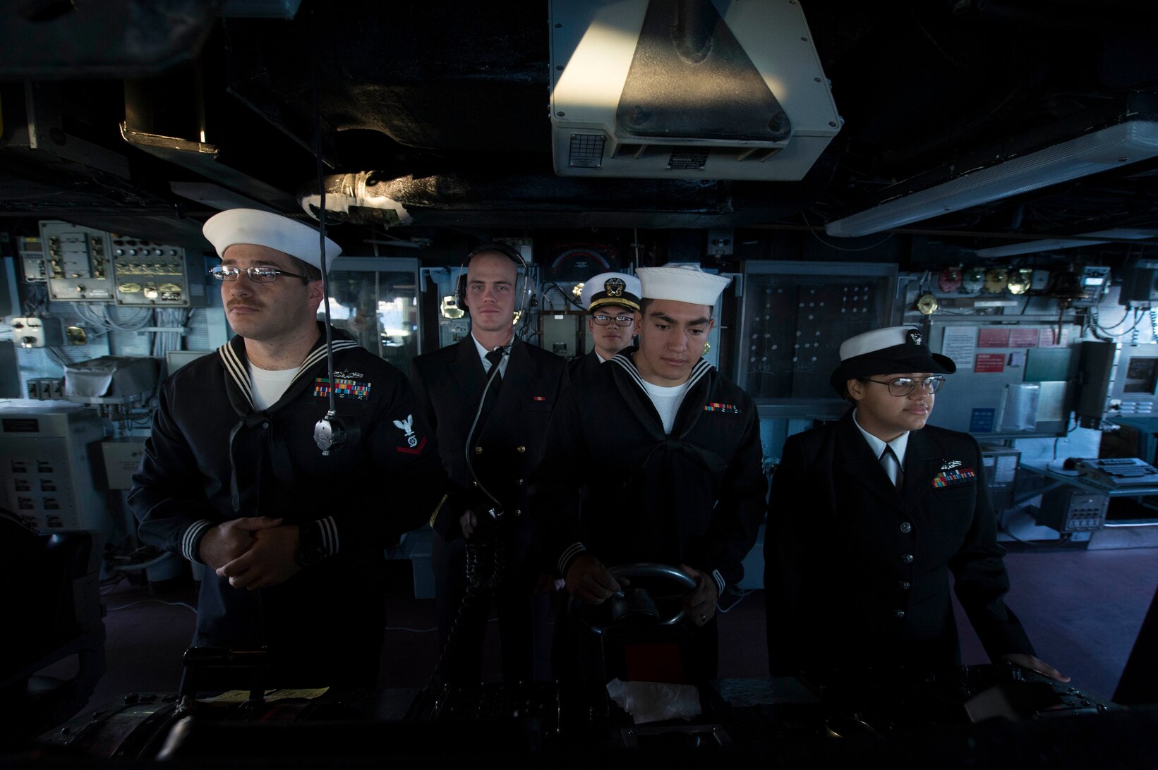 161110-N-ZE250-015 PIRAEUS, Greece (Nov. 10, 2016) Sailors aboard USS Carney (DDG 64) man the helm while arriving in port in Piraeus, Greece Nov. 10, 2016. Carney, an Arleigh Burke-class guided-missile destroyer, forward-deployed to Rota, Spain, is conducting a routine patrol in the U.S. 6th fleet area of operations in support of U.S. national security interests in Europe. (U.S. Navy photo by Petty Officer 3rd Class Weston Jones/Released)
