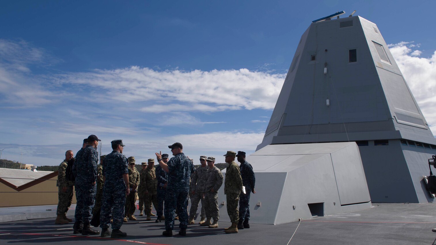 161115-N-HV059-023 NAVAL STATION GUANTANAMO BAY (Nov. 15, 2016) Lt. Aaron Getty explains features of the USS Zumwalt (DDG 1000) to a tour group aboard the ship. Crewed by 147 Sailors, Zumwalt is the lead ship of a class of next-generation destroyers designed to strengthen naval power by performing critical missions and enhancing U.S. deterrence, power projection and sea control objectives. (U.S. Navy photo by Petty Officer 2nd Class Sonja Wickard/Released)